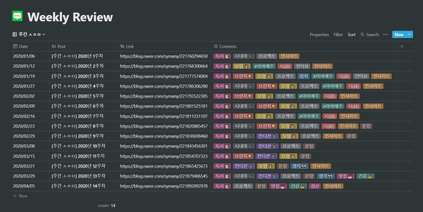 작년 위클리 리뷰는 이 블로그에서 기록했다가 네이버 블로그로 옮겼다. 지금은 14주차까지 기록했다. 발행한 날짜, 제목, 링크, 콘텐츠 등을 노션에 모아두고 있다. 이렇게 모아두니 내가 매주 어떤 콘텐츠를 작성했는지 한 눈에 보인다. 한 해가 끝날 때 기록된 52개의 '주간'을 한두시간 정도 투자해서 읽는 재미가 쏠쏠하다. 내가 걸어온 길이 보이기도 하고. 그 당시 어떤 생각을 하고 있는지도 알 수 있다. 가끔은 길이 막혔을 때 힌트도 준다.