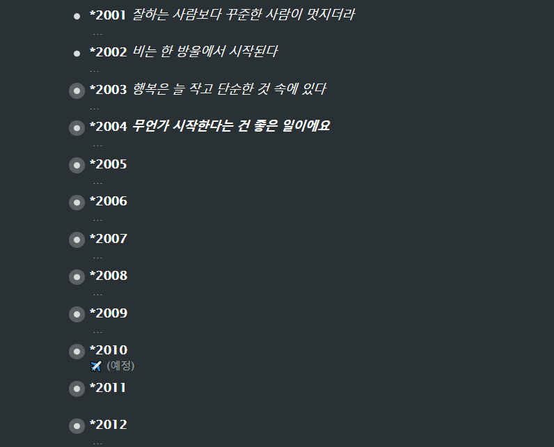WorkFlowy(이하 WF)에는 캘린더 템플릿을 만들어 'month'를 기준으로 매일 기록하고 있다. 새로운 달이 시작되기 전에 다음 한 달에 '어땠으면 하는 마음'을 날짜(*yymm) 옆에 슬로건처럼 붙여놓는다. 1월에는 꾸준하기를, 2월에는 아무리 큰 일이라도 시작하는 마음에서, 3월에는 코로나로 뒤숭숭했을 때 행복은 작은 것에 있다는 다짐을, 4월에는 바로 이번 글의 주제인 무엇이든 시작하는 마음을 담았다. WF에 매일 20~30줄을 기록하면 별 것 아닌 거 같지만 한 달이 되면 무시할 수 없는 양이 된다. 어떤 날은 기록할 내용이 많아 수 백줄을 넘기도 하고, 어떤 날에는 기록할 것이 없어 생각을 쥐어짜기도 하지만.