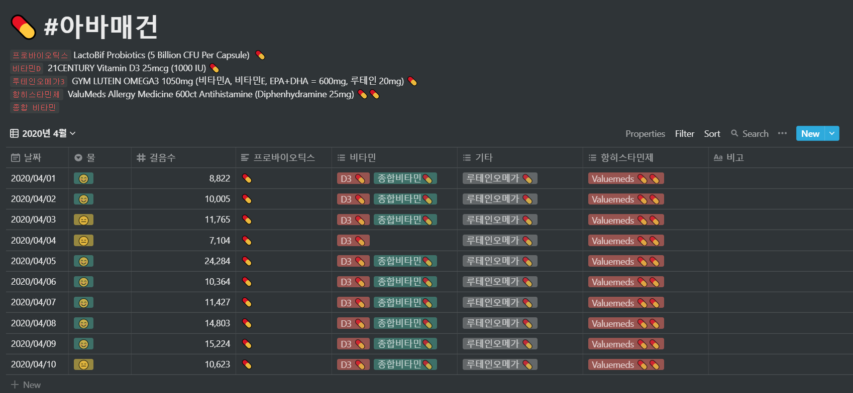 물은 많이 마시고 커피보다는 차를. 커피를 마셔야 한다면 라떼보다는 아메리카노를 지향하는 모임이다. 다들 영양제도 관심이 많아서 말만 하면 바로 구매각.. 어쨌든 이렇게 서로 인증하다보니 물 마시는 거나 영양제 먹는 걸 잊을 수가 없다. 나는 저녁마다 노션에 만들어놓은 템플릿을 인증한다. 올해 이 모임은 꾸준히 되었으면! 😀