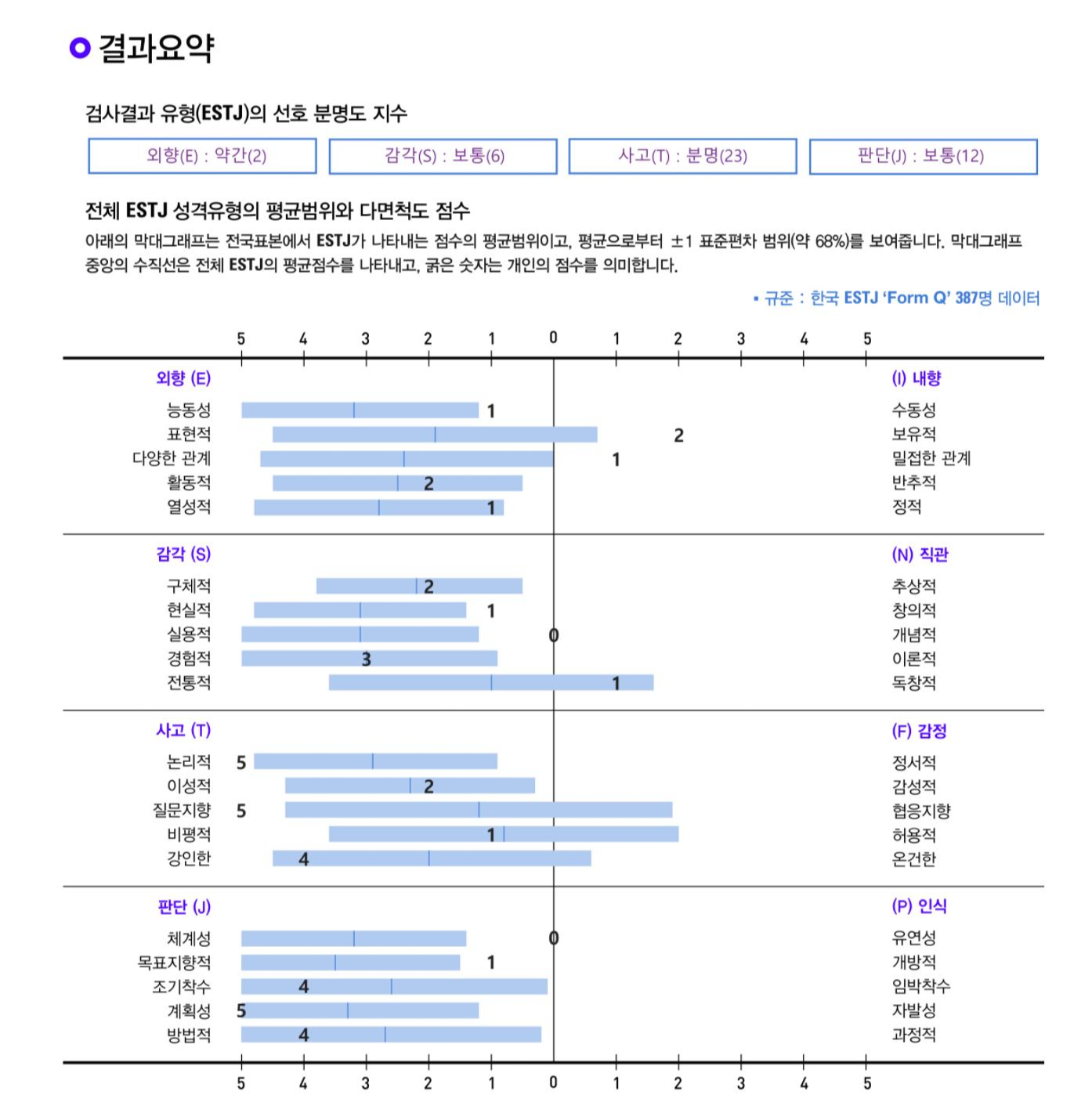 2020년 5월. 모임 사람들과 다시 한 번 MBTI 검사를 받아봤다. 가장 최근에 받은 검사가 2017년쯤인데. 그때도 ESTJ였다. 다만 차이점이 있다면 매우 분명, 분명보다 보통, 약간으로 수치가 낮아진 것.