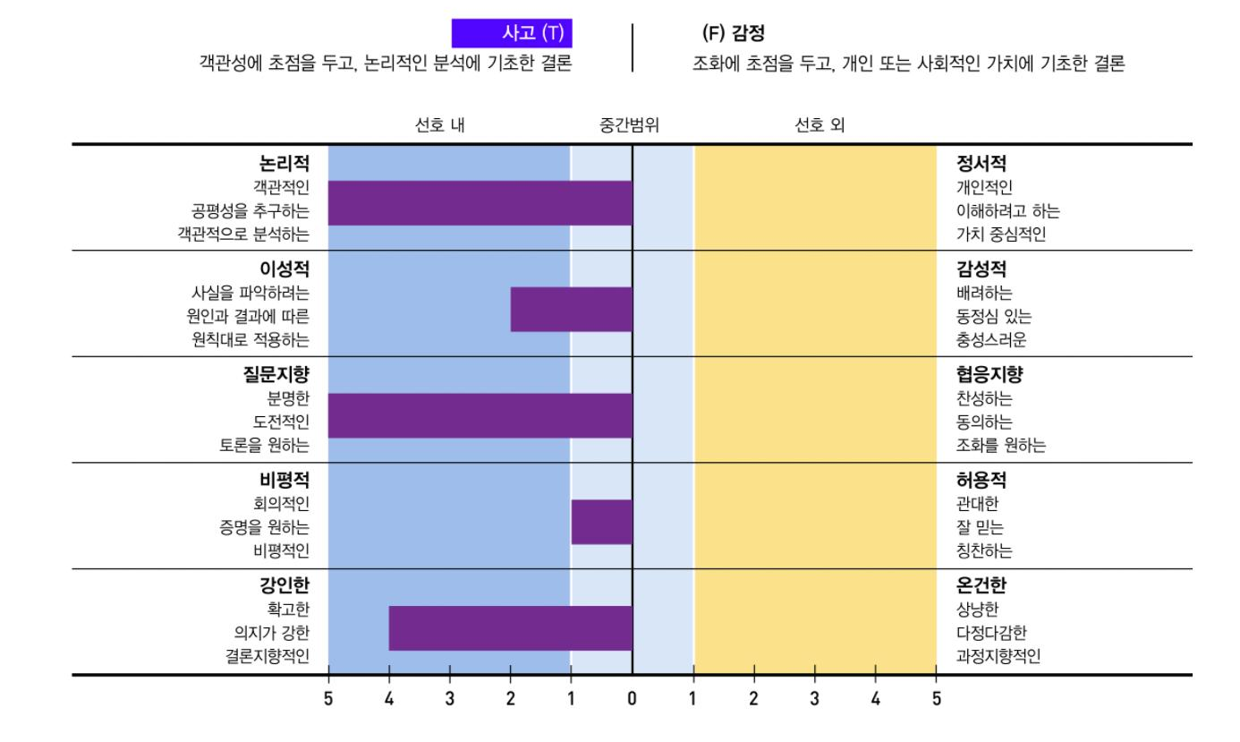 이 결과는 혼동할 가능성이 많은데 제대로 보는 방법은 하늘색으로 그려진 게 나와 같은 유형을 가진 사람들의 평균 분포도다. 내가 위치한 건 점수로 표시된다. 즉 저 분포에 벗어나는 건 아웃라이어라는 뜻이다. 나는 평균의 ESTJ보다 내향적이고, 그들 무리에서는 더 직관적이고, 더 사고적이고, 더 판단적이라고 생각하면 된다. 0에 위치한 건 양쪽 둘 다 잘 쓴다는 뜻이다.