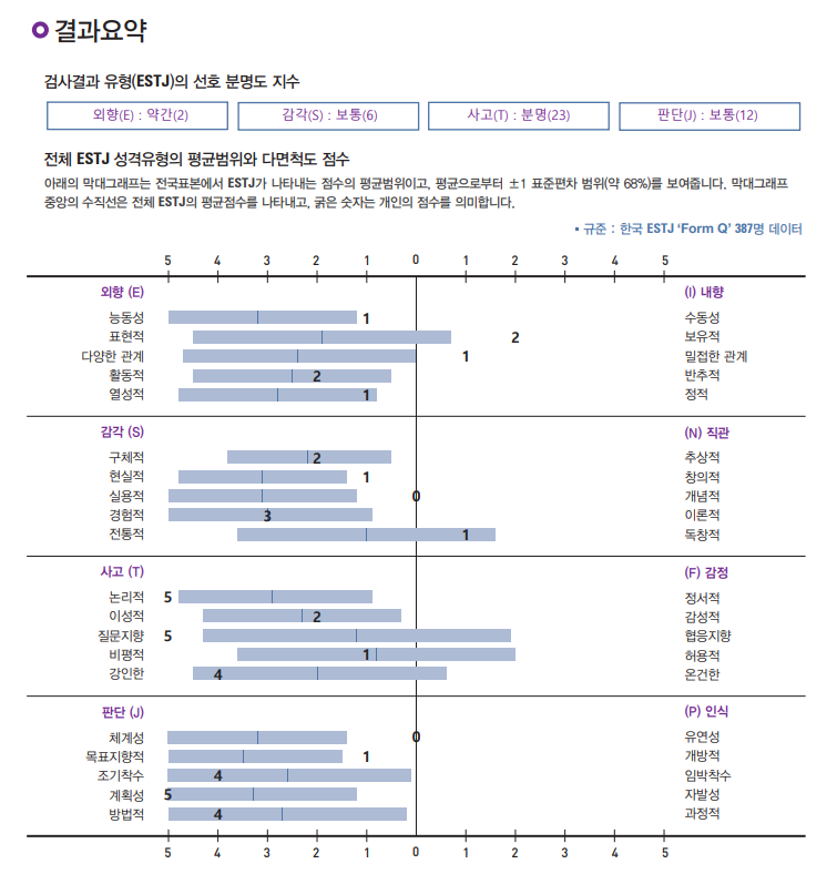 Form Q 검사를 받으면 이렇게 결과가 자세히 나온다. 그래서 비용이 쪼금 비싸다. 위 그래프에서 숫자가 내 데이터고, 파란색 막대가 표준 분포다. 나는 다른 ESTJ보다 내향적이고, 약간 직관적이며, 논리/질문지향/조기착수/계획성/방법적인 것을 무척 선호한다고 볼 수 있다.