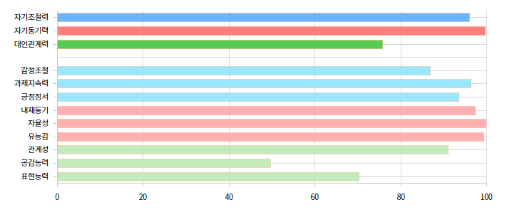 나는 과제 지속력, 내재동기, 자율성, 유능감, 긍정 정서가 특히 높게 나왔다. 이 말을 풀어보면 내가 좋아하고 자발적으로 한 건 꾸준히 할 수 있다는 뜻이다. 즉 내가 하고 싶은 것을 해야 잘할 수 있다는 말이 되기도 한다. 참고로 감정조절이 높은 사람은 참을성이 높은 사람인데, 그럴수록 직장생활 근속연수가 높다. (뇌피셜)