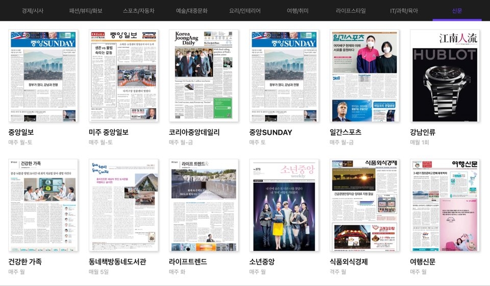 중앙그룹에서 운영중인 신문, 잡지 구독서비스다. 월 구독료는 9,900원. 중앙일보를 포함해서 경제/시사, 패션/뷰티/화보, 예술/대중문화/, IT/과학/육아 등 다양한 분야의 잡지를 모바일에서 받아볼 수 있다.
