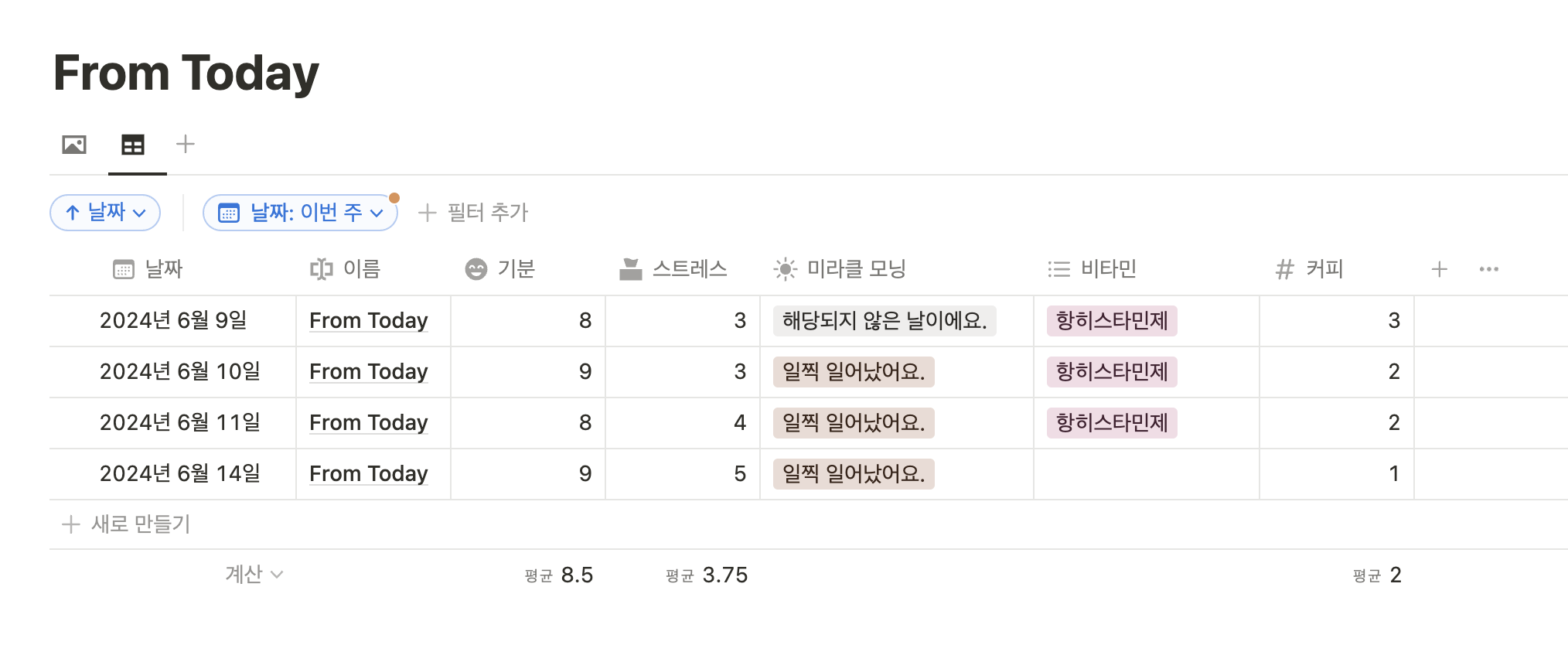 대구 출장 갔을 때 From Today를 못했네요. 그때 제외하고는 From Today를 열심히 했습니다. 매일 기분, 스트레스, 미라클모닝, 비타민, 커피, 업무 등 다양한 형태의 하루일기를 설문조사로 제출하고 있습니다. 그리고 자동으로 노션에 기록이 됩니다 :)