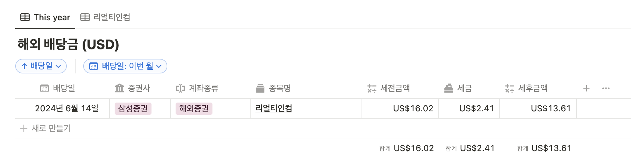 월배당 주는 리얼티인컴의 배당이 들어왔습니다. 주식 수를 조금씩 늘리다보니 이제 16달러 정도 나오네요. 여기서 10배면 160달러, 100배를 사면 1600달러겠네요. 월 1600달러 정도만 돼도 쏠쏠하겠어요. ㅎㅎ 리얼티인컴은 배당컷한 적이 없기 때문에, 배당컷하기 전까지 계속 모아가야겠습니다.