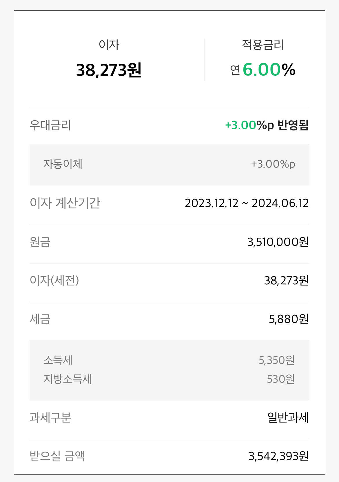 작년 12월부터 넣었던 카카오뱅크 6%짜리 적금 하나가 드디어 만기가 되었습니다. 6% 금리면 그래도 센 편에 속하는데 이자가 아주 귀엽네요. ㅎㅎㅎ 26주짜리 적금을 풍차 돌려서 열심히 넣는 분들도 계시는데 저는 그렇게까지는 못하겠더라고요. 너무 귀찮습니다. 당분간 26주 적금 콜라보가 아주 매력적이지 않으면 당분간은 있는 적금이나 잘 들어야겠습니다.