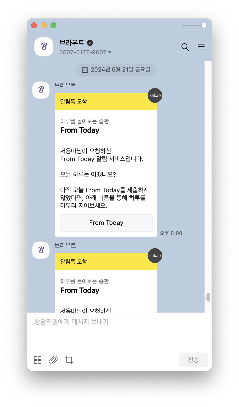 그리고 오후8시, 9시, 11시에는 카카오 알림톡이 전달되어서 잊지 않고 기록하게 만들어두었습니다.