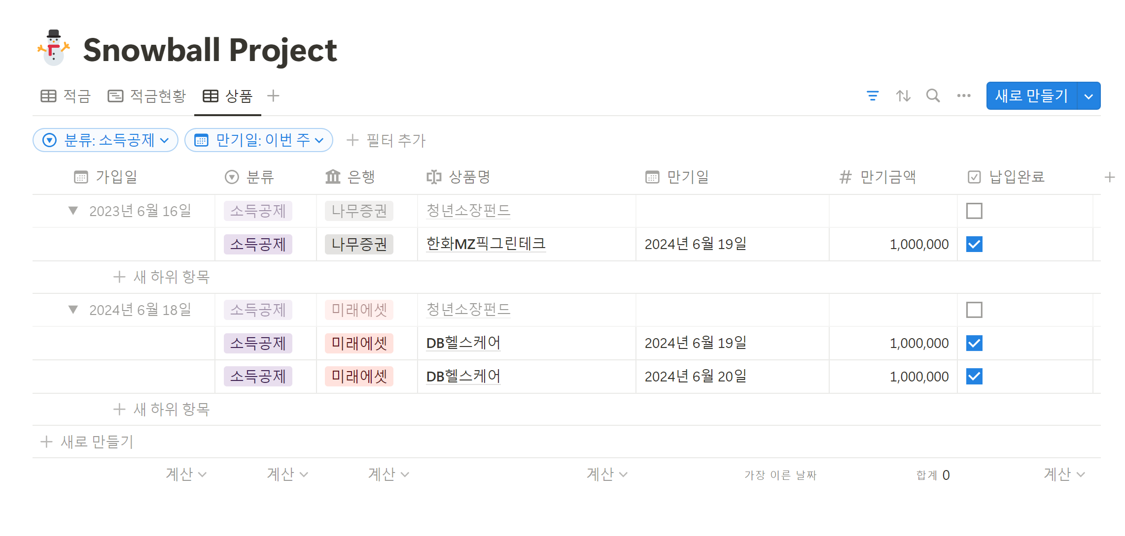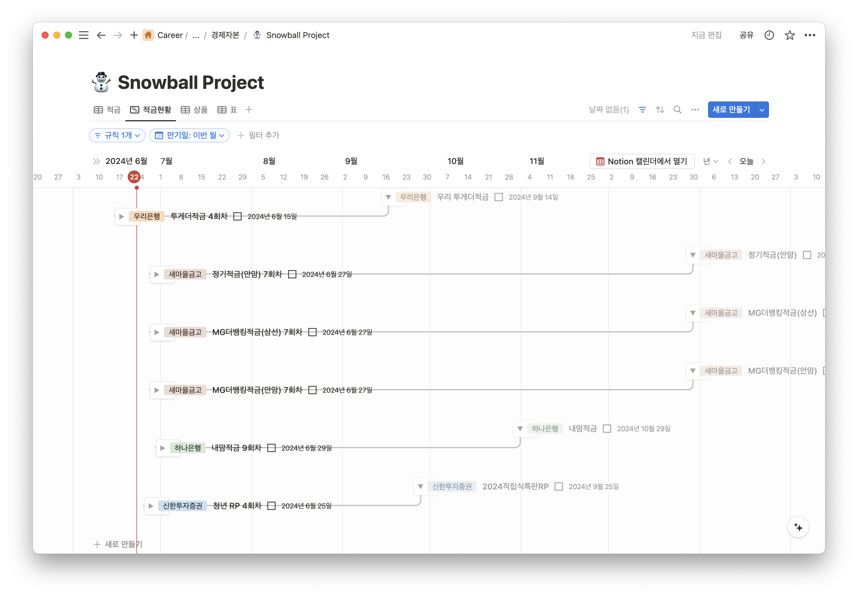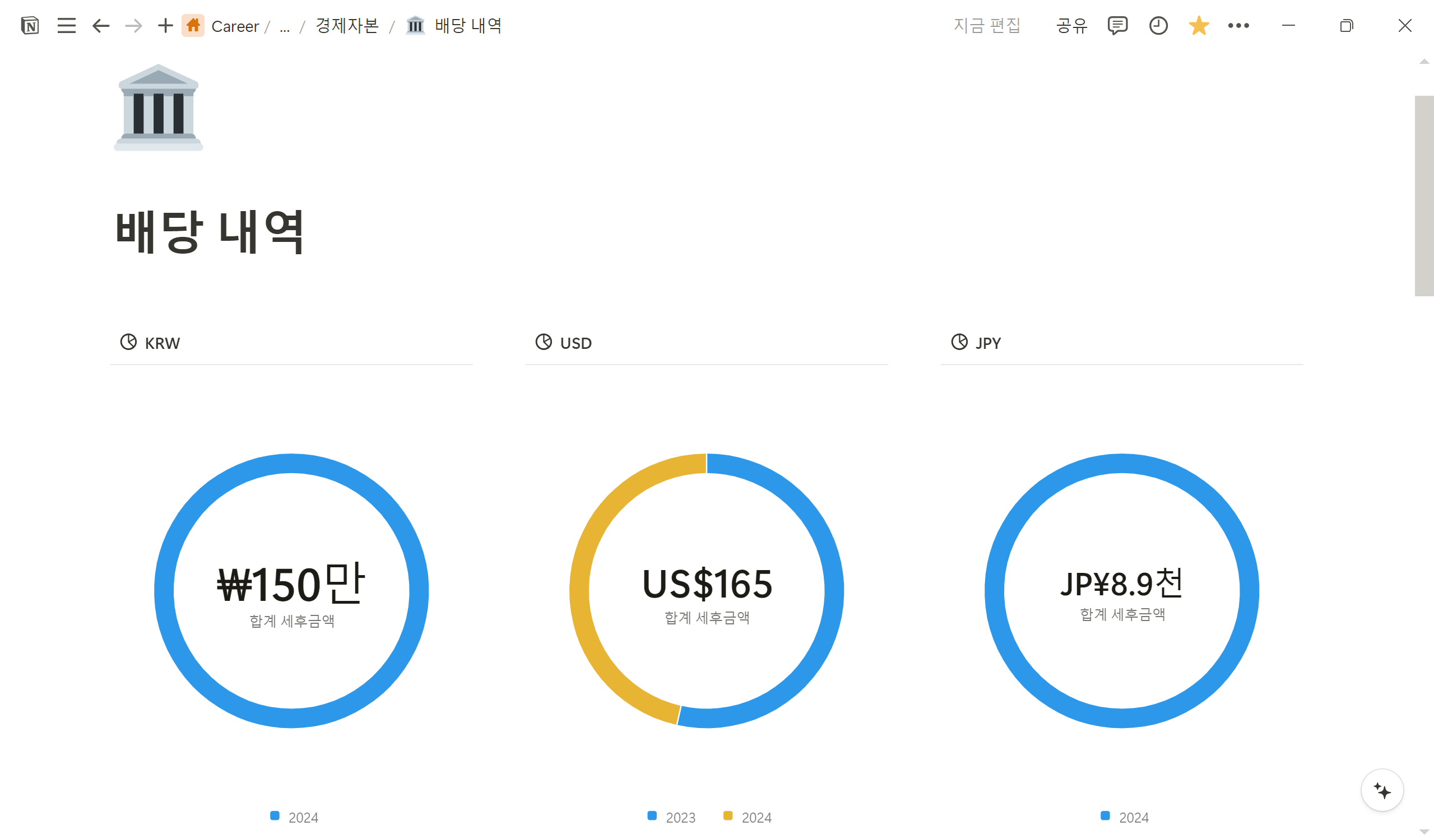 노션에 차트 기능이 업데이트된 기념으로, 정리 중인 투자 및 저축 페이지를 정리했습니다. 연간 배당금과 납입해야할 적금 리스트들이 한 눈에 잘 보여서 좋네요!