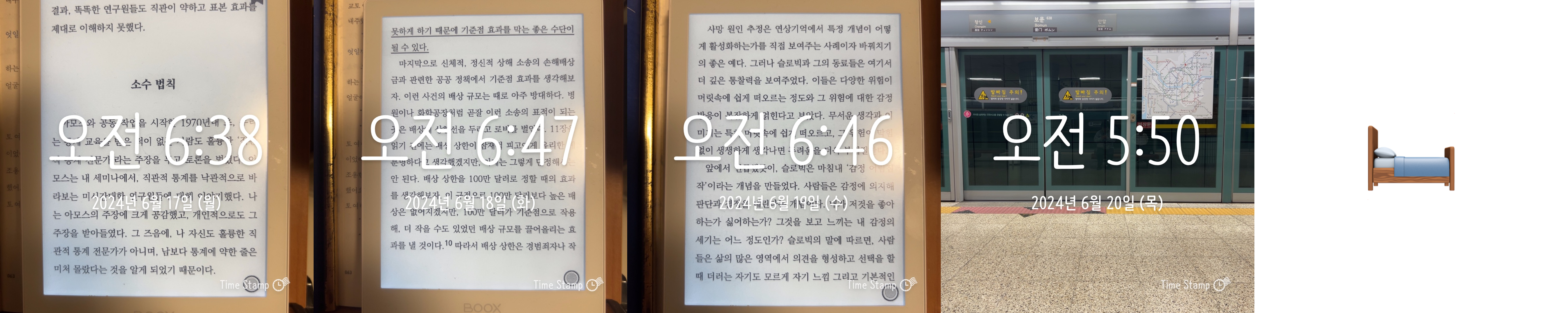 5일 중 4일을 일찍 일어났습니다. 목요일은 아침 일찍 부산에 가야되서 지하철역에서 사진을 찍었네요. 금요일은 전날 부산 당일치기 여파 때문인지 피곤해서 푹 잤습니다. ㅎㅎ 6월 미라클 모닝도 다음 주면 마지막이네요!