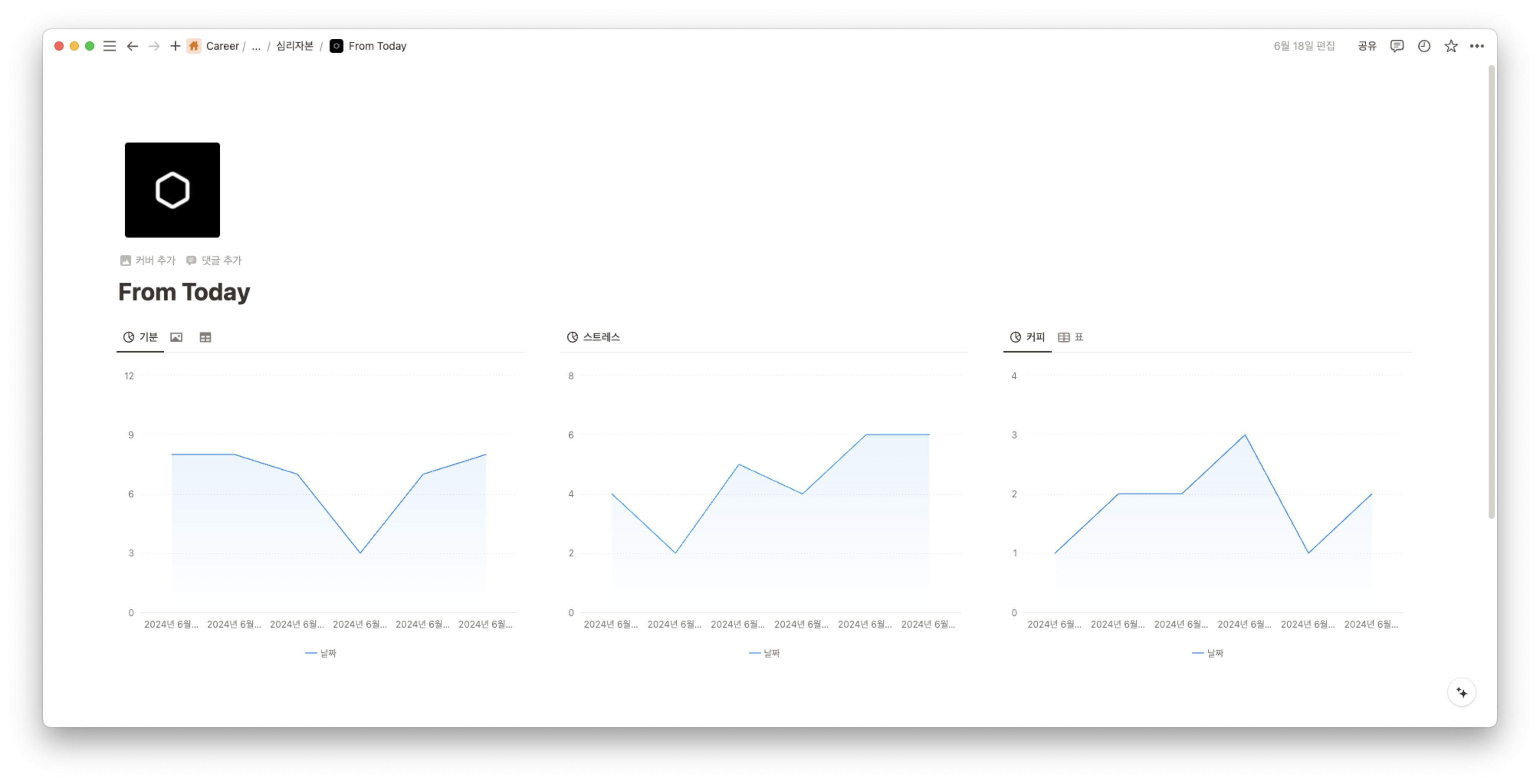 From today는 노션 차트와 카카오 알림톡을 만나니 더 발전하는 느낌이 듭니다. 이번 주 기분, 스트레스, 커피를 차트로 표시하니 직관적이라서 좋아요.