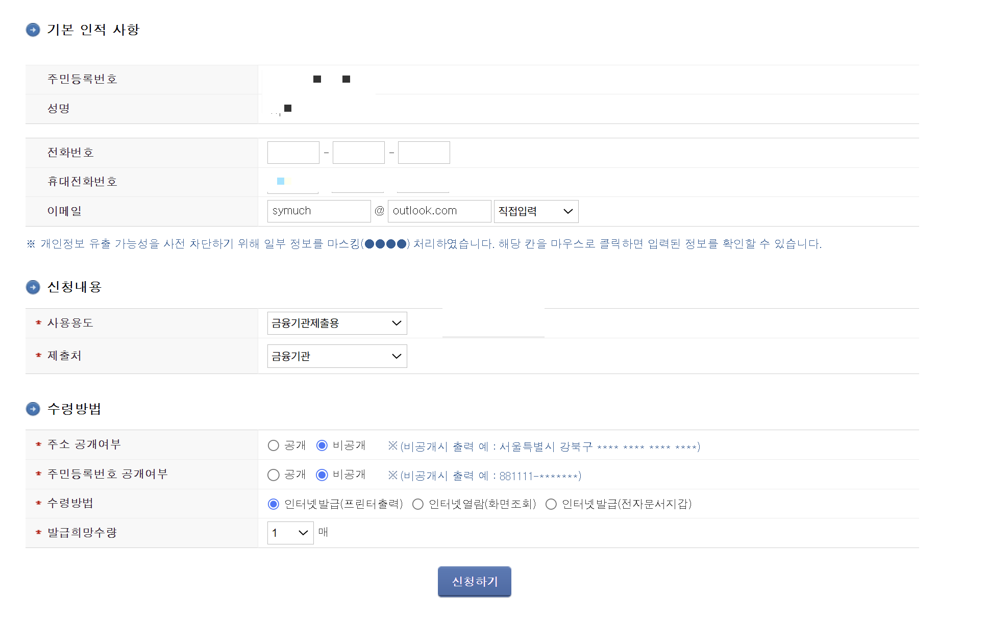 2. 신청할 때는 열람용으로 뽑지 말고 꼭 출력해서 핸드폰으로 찍어둘 것. 주밀번호랑 주소는 비공개처리해야 됨.