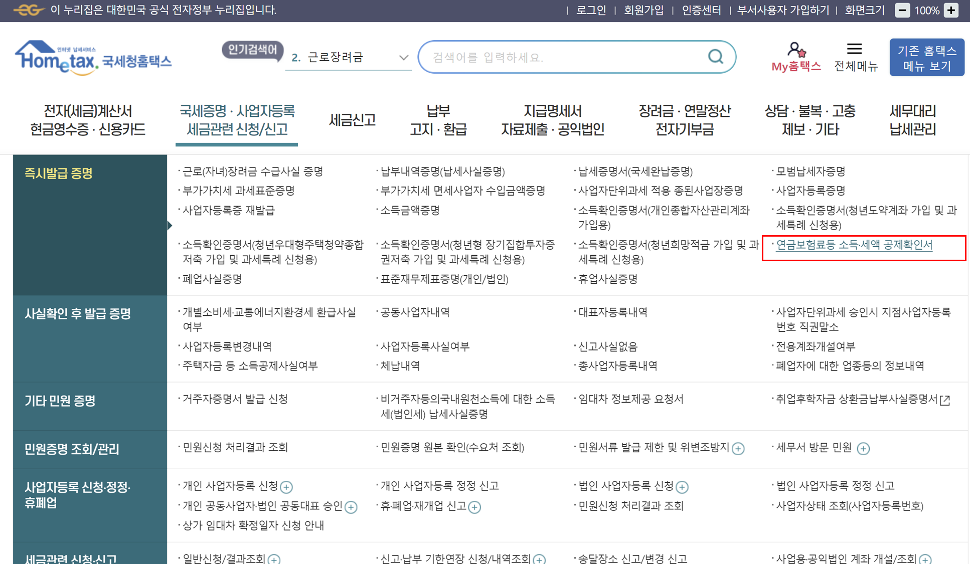 1. 홈택스 접속 - [국세증명,사업자등록 세금관련 신청신고] - [즉시 발급 증명] - [연금보험료 등 소득, 세액공제 확인서] 클릭