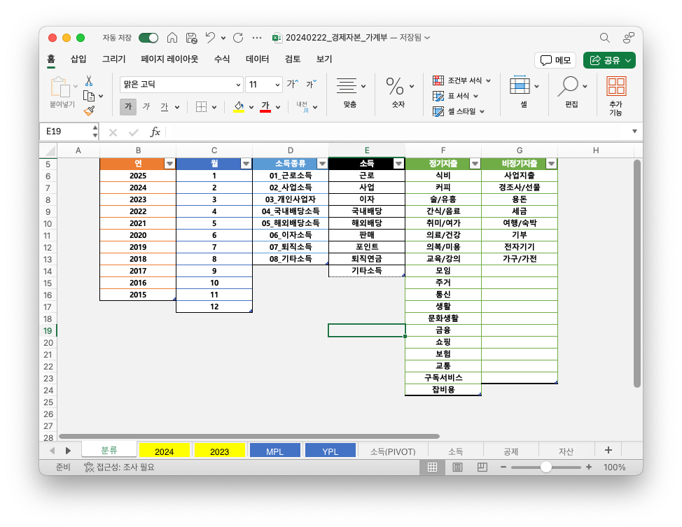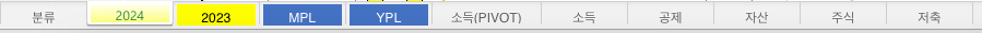 분류부터 소개했는데, 현재 가계부 내에서 시트를 소개하자면 첫 번째로 위에서 소개한 분류가 있고, 그 다음에는 연도별로 한 시트씩 쓰고 있다. 원래는 연도가 바뀔 때마다 가계부 파일을 새로 생성해서 기록했는데, 그렇게 하니 연도별로 기록을 볼 때는 좋지만 여러 연도를 한 번에 확인하기는 어려워서 그냥 통합시켰다.