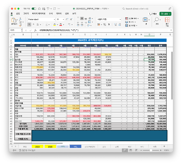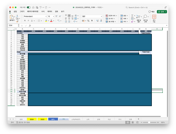 그리고 MPL은 Monthly Profit Loss의 줄임말로 월별손익분기표라고 보면 되겠다. 2024년 1월부터 12월까지 소득, 지출 현황을 보여준다. 그리고 YPL은 Yearly Profit Loss다. 연간손익분기표다. 2015년부터 2024년까지 소득, 지출 현황을 보여준다.