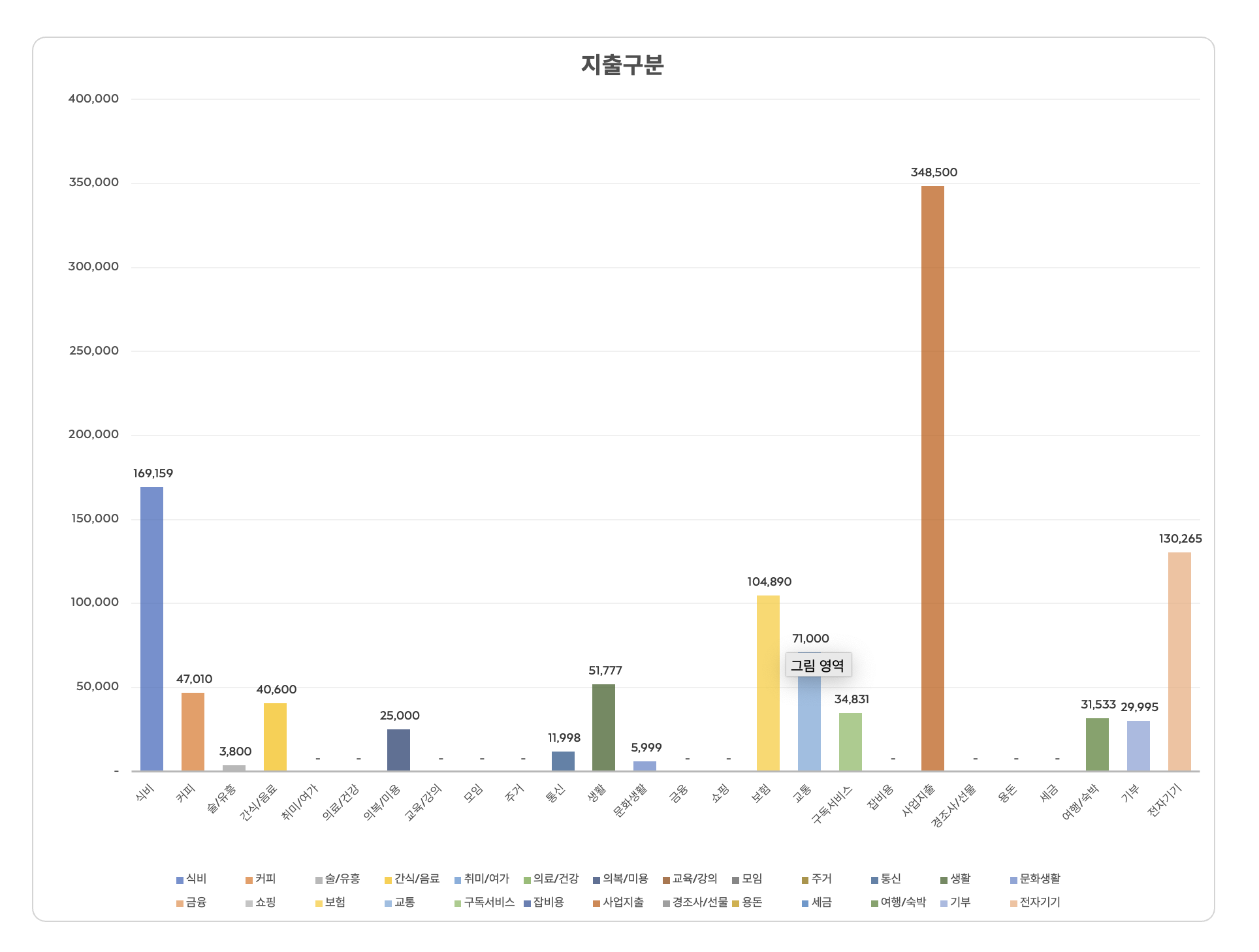 아주 최근에 지출도 정기지출, 비정기지출로 섹션을 나눴다. 나눠보니 정기지출은 거의 일정하다. 반면 비정기지출은 여행, 경조사, 용돈, 전자기기 등 구입한 상품에 따라 차이가 아주 크다. 1년동안 비정기지출을 기록해보고 내년부터는 이 돈을 따로 모아놔야겠다.