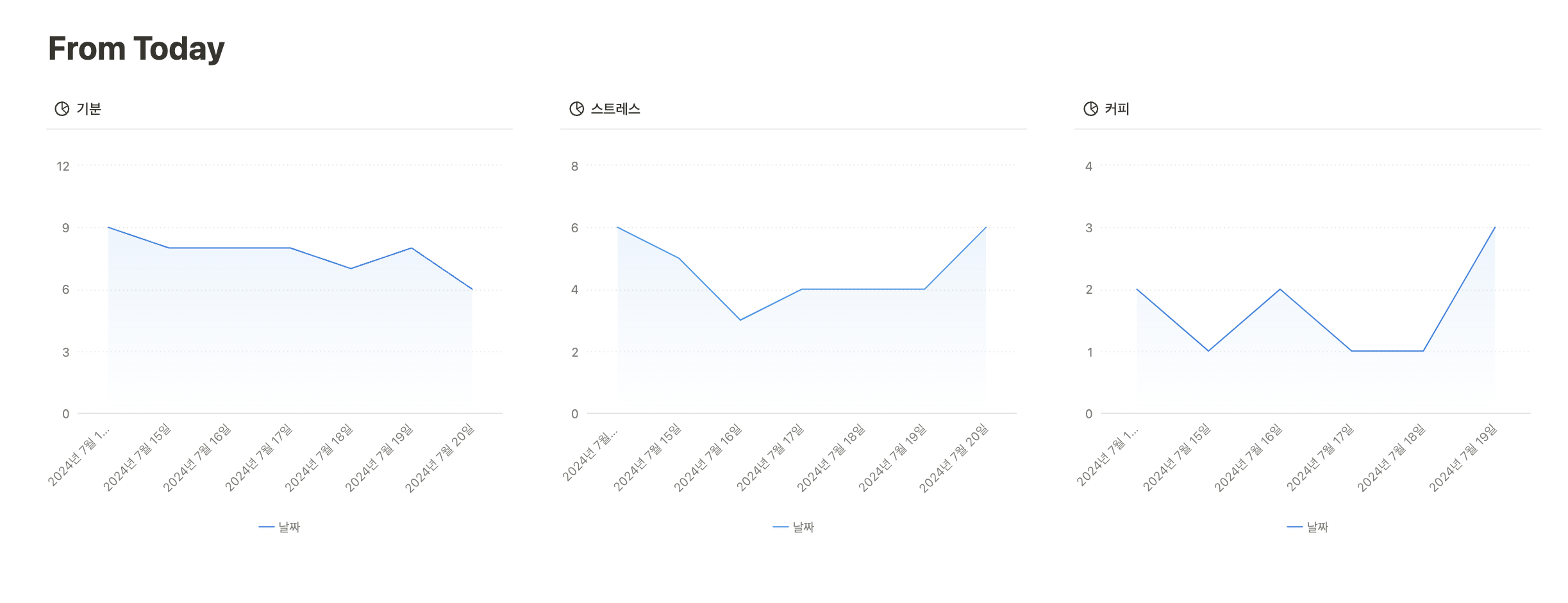 이번 주 기분은 거의 비슷한데 금요일로 갈수록 조금 낮아졌네요. ㅎㅎ 스트레스는 반대로 금요일에 많이 올라갔습니다. 커피는 들쭉날쭉.