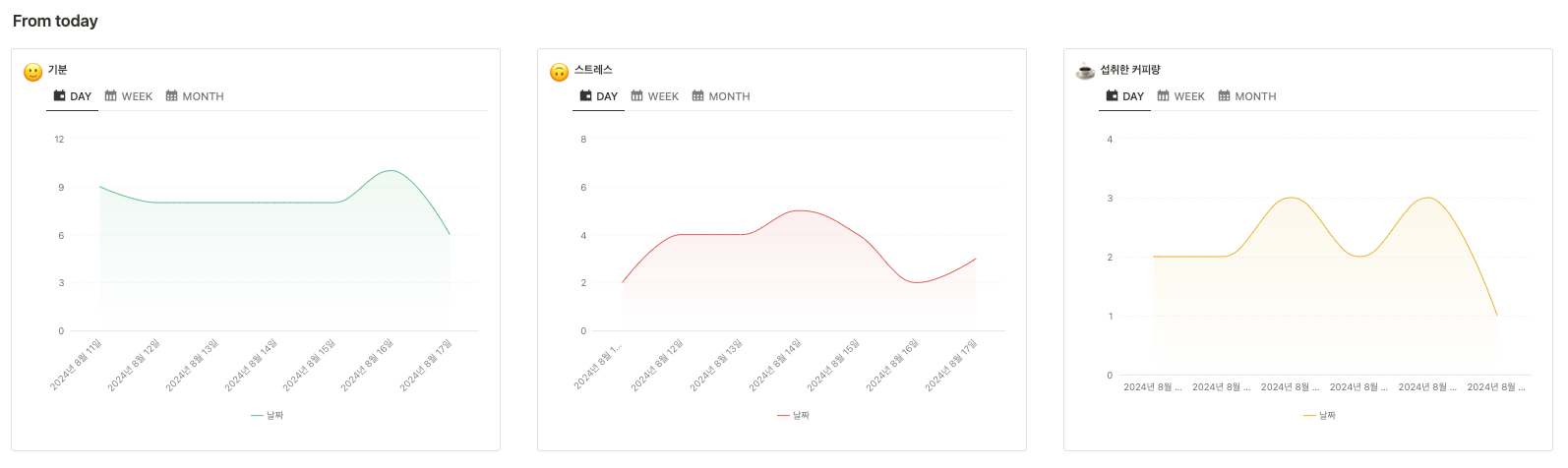 기분, 스트레스, 커피량의 패턴은 늘 예상 범주 안에서 움직이네요! 특히 기분이나 스트레스는 특정 사건의 영향 받는 게 커보입니다 :)
