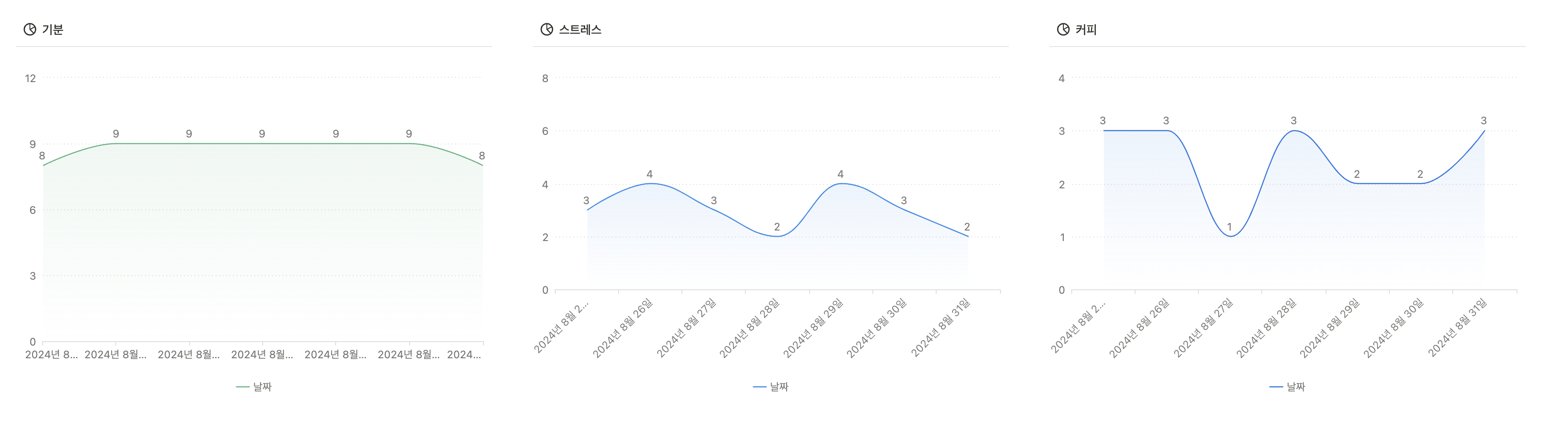 기분은 8~9점으로 완만하고, 스트레스도 2~4점으로 괜춘. ㅎㅎㅎ 커피는 많이 마시는 날이 있지만 나름 나쁘지 않습니다.