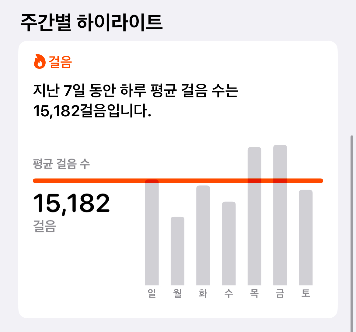 지난 주에는 평균 15,182보를 걸었습니다. 목~금에는 아침 헬스장, 저녁 성북천 산책루틴까지 추가해서 걸음이 확 늘었어요. 이제 날씨도 풀렸겠다 활동량 좀 많이 늘려볼 생각입니다.