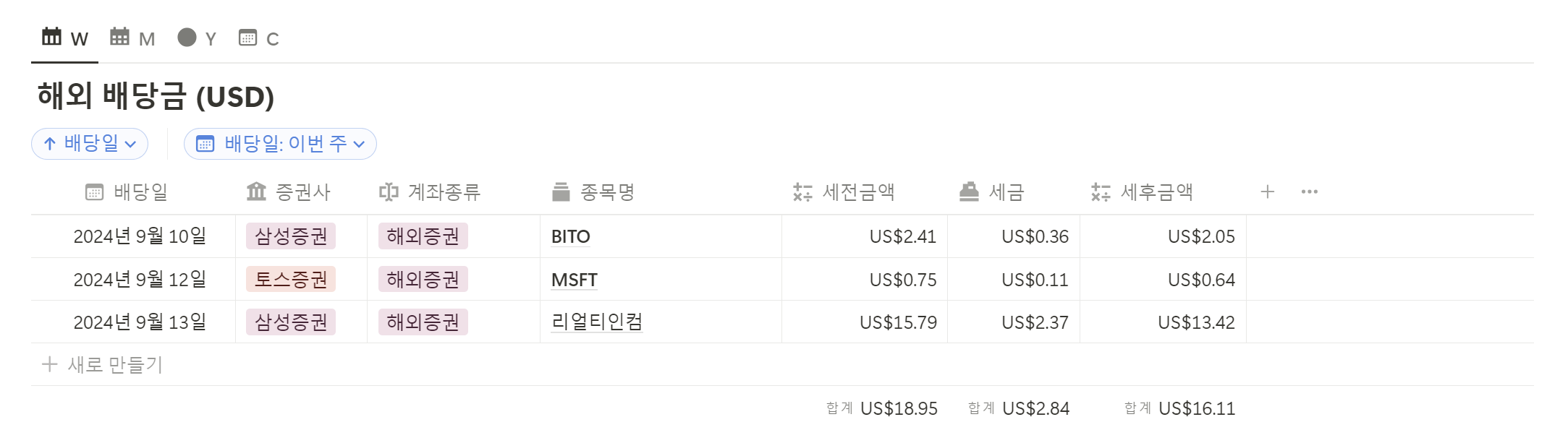 이번에 국내 배당은 없었고요. 해외 배당만 3종목 받았습니다. 소량으로 들고 있는 비트코인 ETF BITO에서 약 2달러, 마이크로소프트와 리얼티인컴에서 0.64달러, 13달러 정도 받았네요. 다음 주는 아마 메인스트리트캐피털에서 월배당이 나올듯 합니다 :-)
