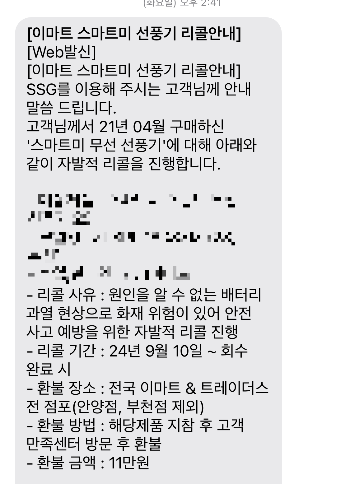 거의 이제 1~2년만 더 쓰고 이제 슬슬 바꿔야겠다고 생각하고 있었는데, 갑자기 이마트에서 선풍기 리콜한다는 문자가 왔습니다. 이마트로 들고 오면 11만원 현금으로 환불해주겠다. 배터리에 문제가 있다고 하니 더 쓰기도 찜찜하니 바로 이마트 가서 리콜했답니다.