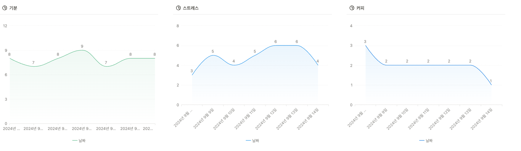 이번 주 기분은 7~8점, 스트레스는 최대 6점까지 치솟았네요. 이번 주는 환절기+두통 이슈가 좀 컸습니다. 커피는 평소보다 덜 마신 편!