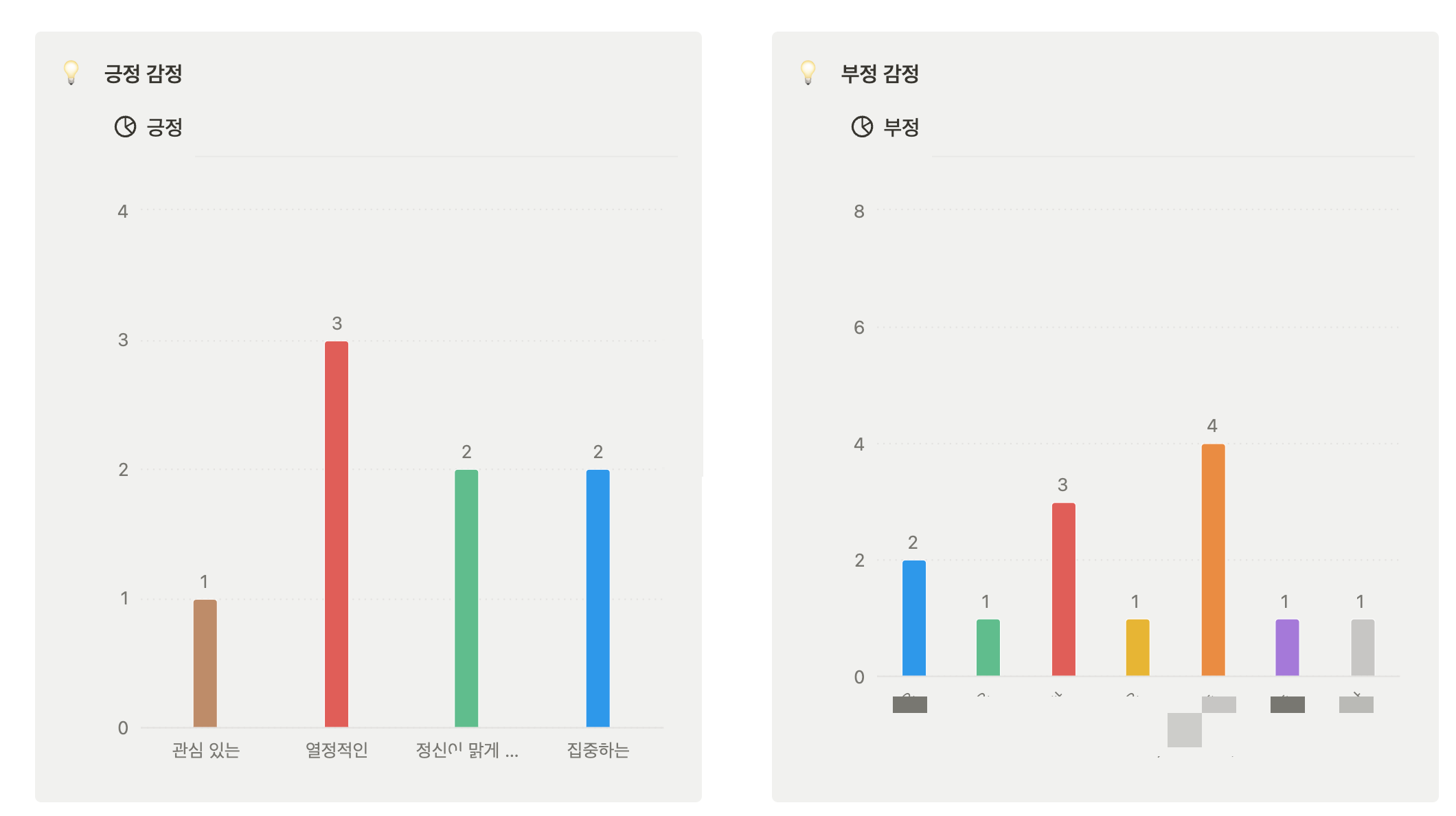 요즘엔 긍정감정, 부정감정도 기록해보는 중. 적어보니 내가 어떤 감정들을 주로 쓰는지 알겠다.
