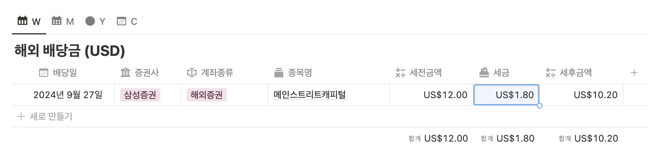 메인스트리트캐피털에서 배당이 들어왔다. 세전 약 12달러 정도.