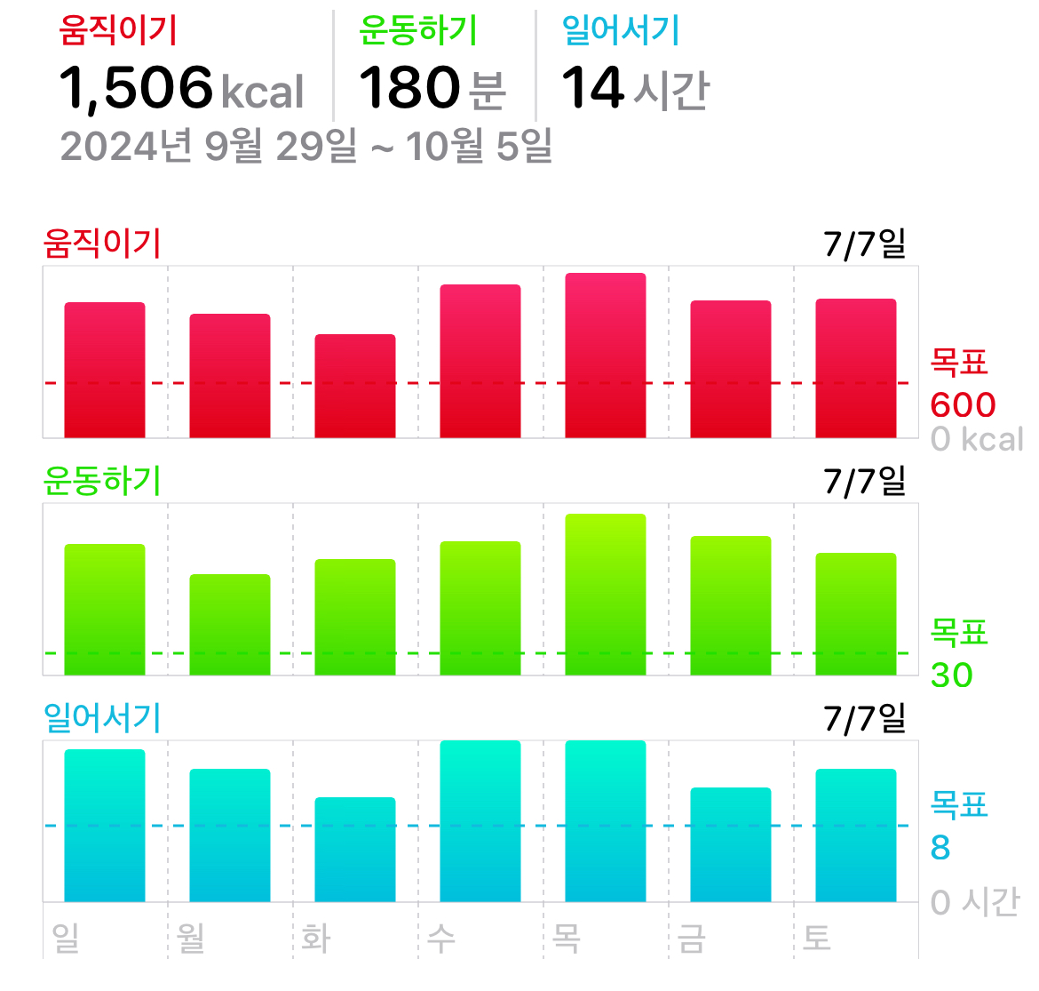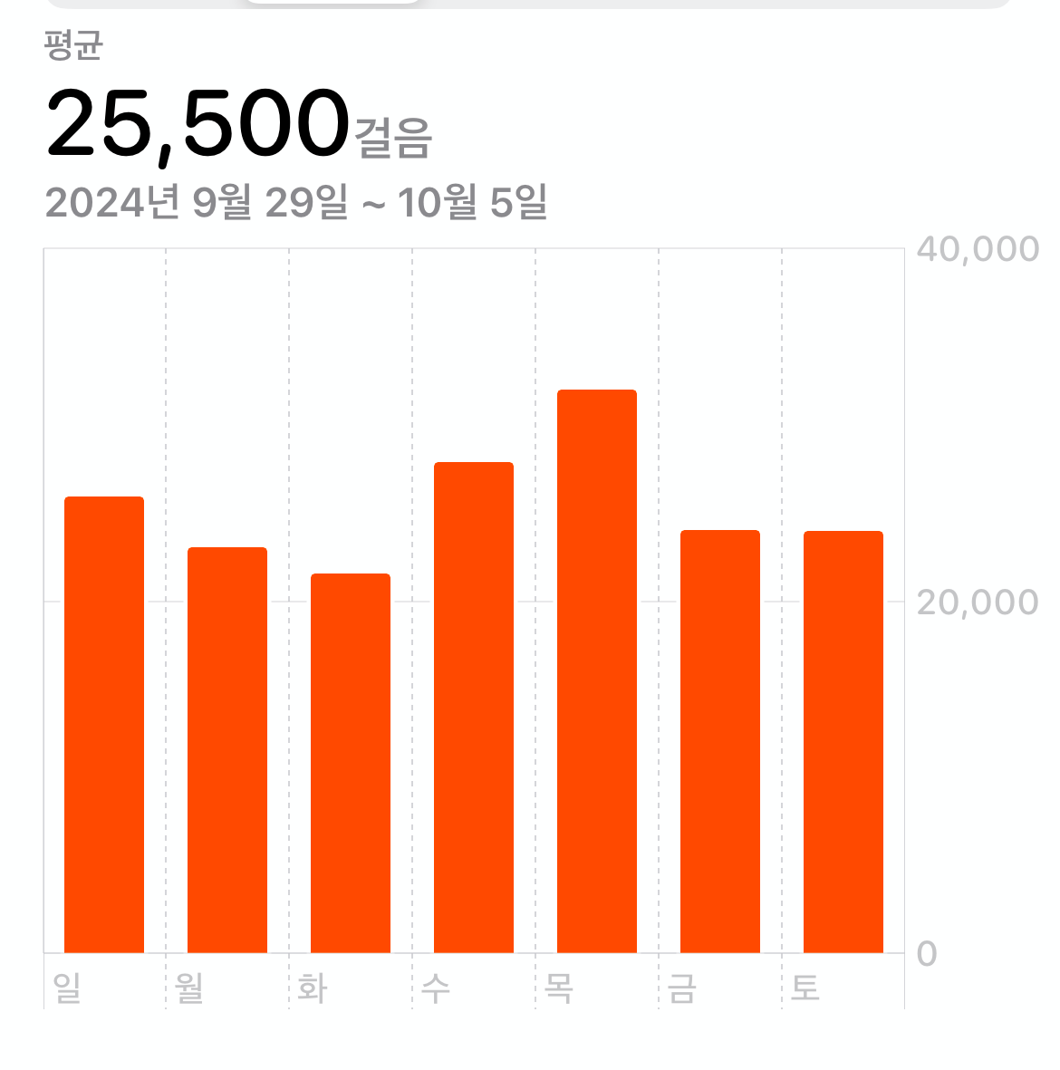 이번 주는 평균 25,500보를 걸었다. 애플워치 세 개의 링도 훌륭한 성적. 이 정도 페이스를 꾸준히 유지했으면.