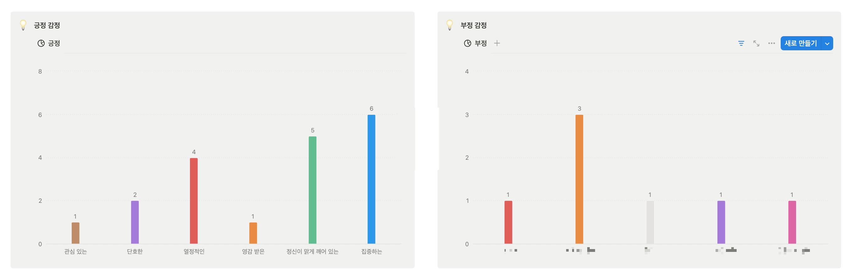 긍정 감정, 부정 감정도 꾸준히 기록 중. 집중하는 긍정 감정을 많이 쓰네. 역시 강점인가. 뭔가 말똥말똥하고, 열정적이고 집중하는 긍정을 좋아하는 듯?