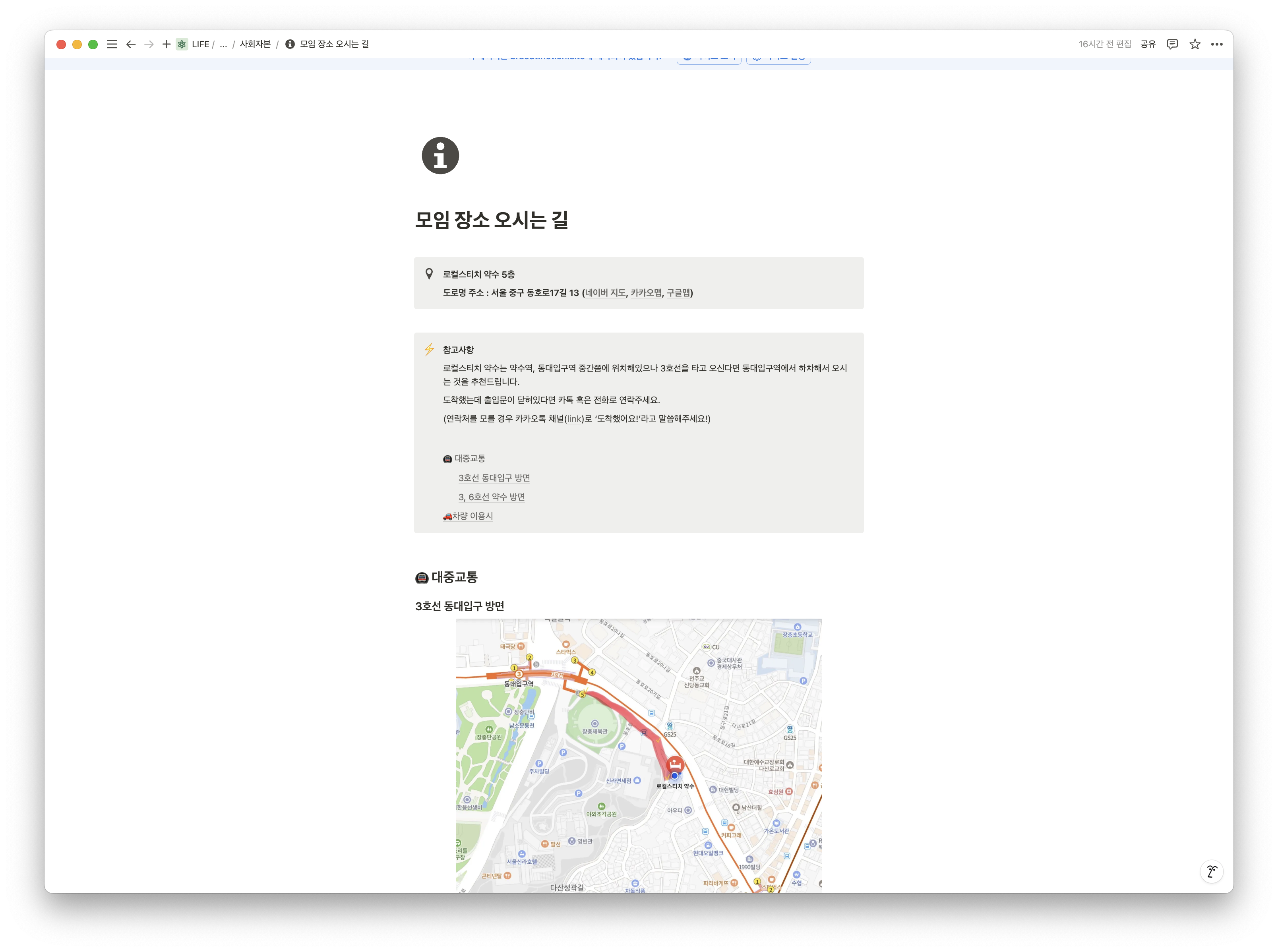 항상 모임 때 장소를 헷갈려하는 분들이 있어서, 노션으로 페이지를 하나 만들었다. 대중교통으로 올 때, 차량으로 이용할 때 어떻게 와야하는지 적어놨다. 알림톡으로 장소공지할 때 네이버 지도 링크로 보냈는데, 앞으로는 이 노션 링크로 보내야지.