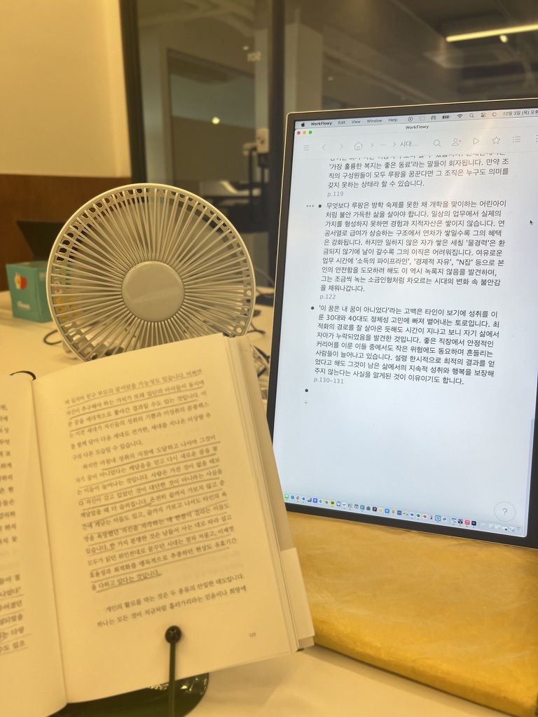 내 자리도 하나씩 짐 꾸리는 중. 그램뷰는 WF용으로 세로로 쓰고, 아이패드는 신문+메모 or 넷플릭스용으로 쓰기 위해 세팅했고 평소에 꺼내보는 책이나 읽어야할 책들을 쌓아놨다. 북스탠드에는 가장 최근에 읽은 책을 뒀다. 오후가 되면 내 자리에 햇빛이 들어와서 좋음. 눈이 부시면 커텐을 치면 되긴 하는데 햇빛 맞으면서 일하는 게 그냥 좋다.