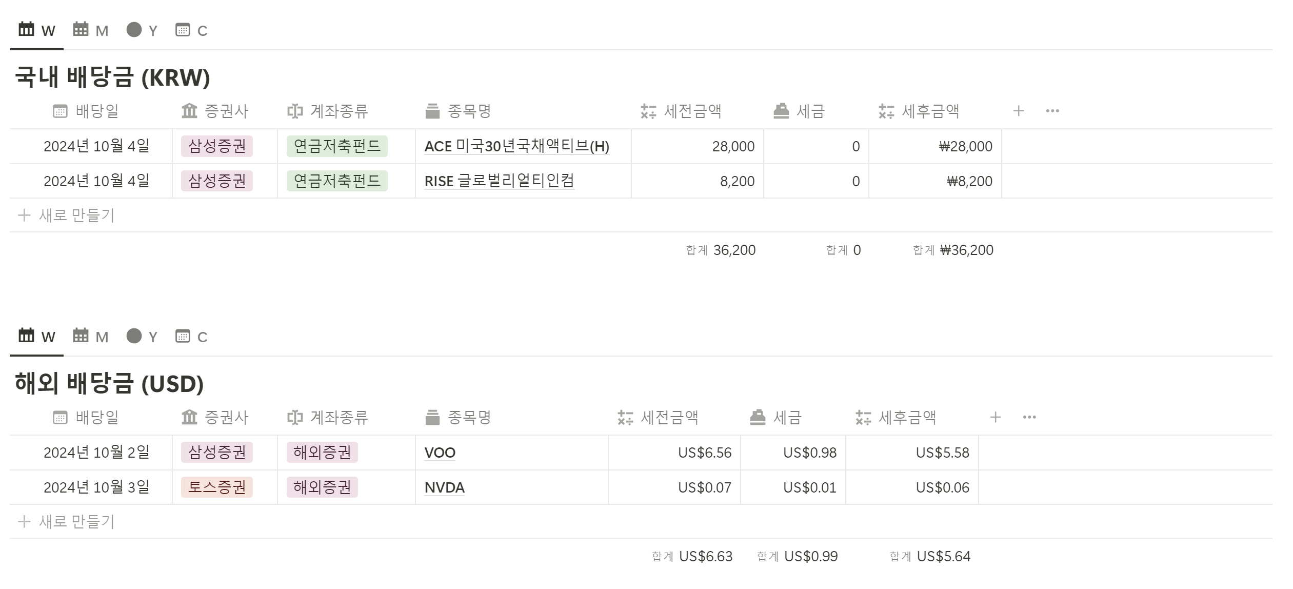 연금저축펀드 계좌에서 미국30년국채 액티브랑 글로벌 리얼티인컴 ETF 배당을 받았다. 합쳐서 약 36,000원 정도. 해외 배당으로는 S&P 추종하는 VOO랑 엔비디아에서 조금 배당을 줬다. 둘이 합쳐서 세후 5.64달러 정도.