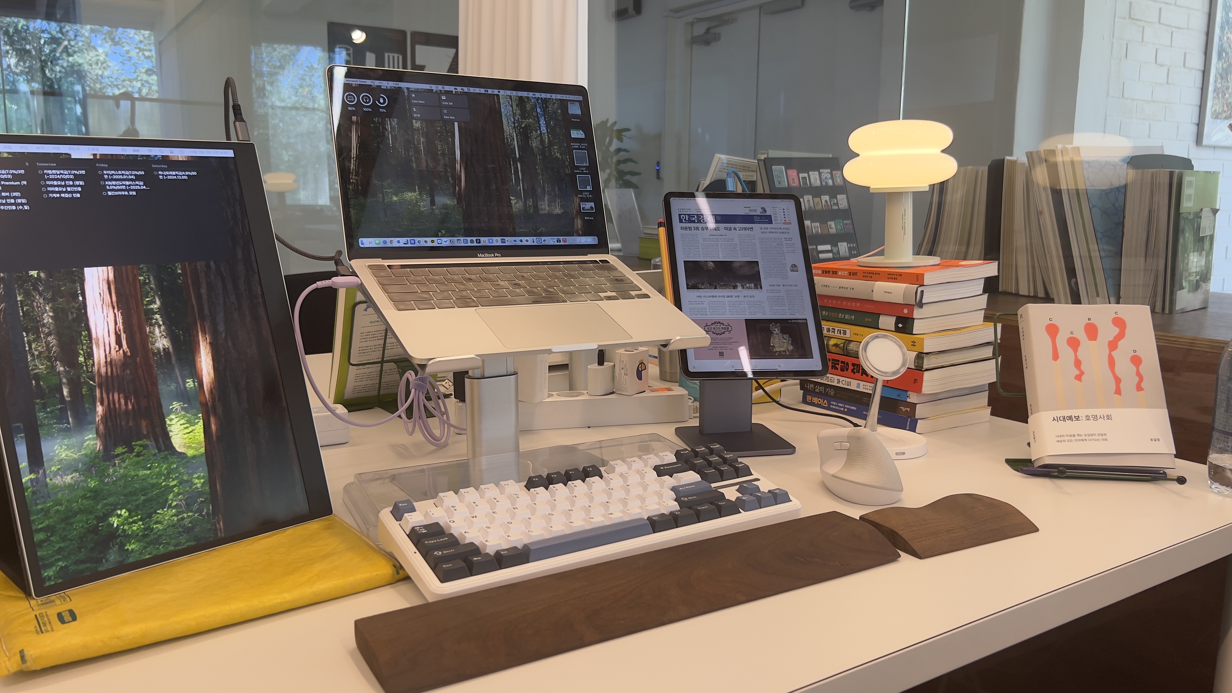 내 자리도 하나씩 짐 꾸리는 중. 그램뷰는 WF용으로 세로로 쓰고, 아이패드는 신문+메모 or 넷플릭스용으로 쓰기 위해 세팅했고 평소에 꺼내보는 책이나 읽어야할 책들을 쌓아놨다. 북스탠드에는 가장 최근에 읽은 책을 뒀다. 오후가 되면 내 자리에 햇빛이 들어와서 좋음. 눈이 부시면 커텐을 치면 되긴 하는데 햇빛 맞으면서 일하는 게 그냥 좋다.