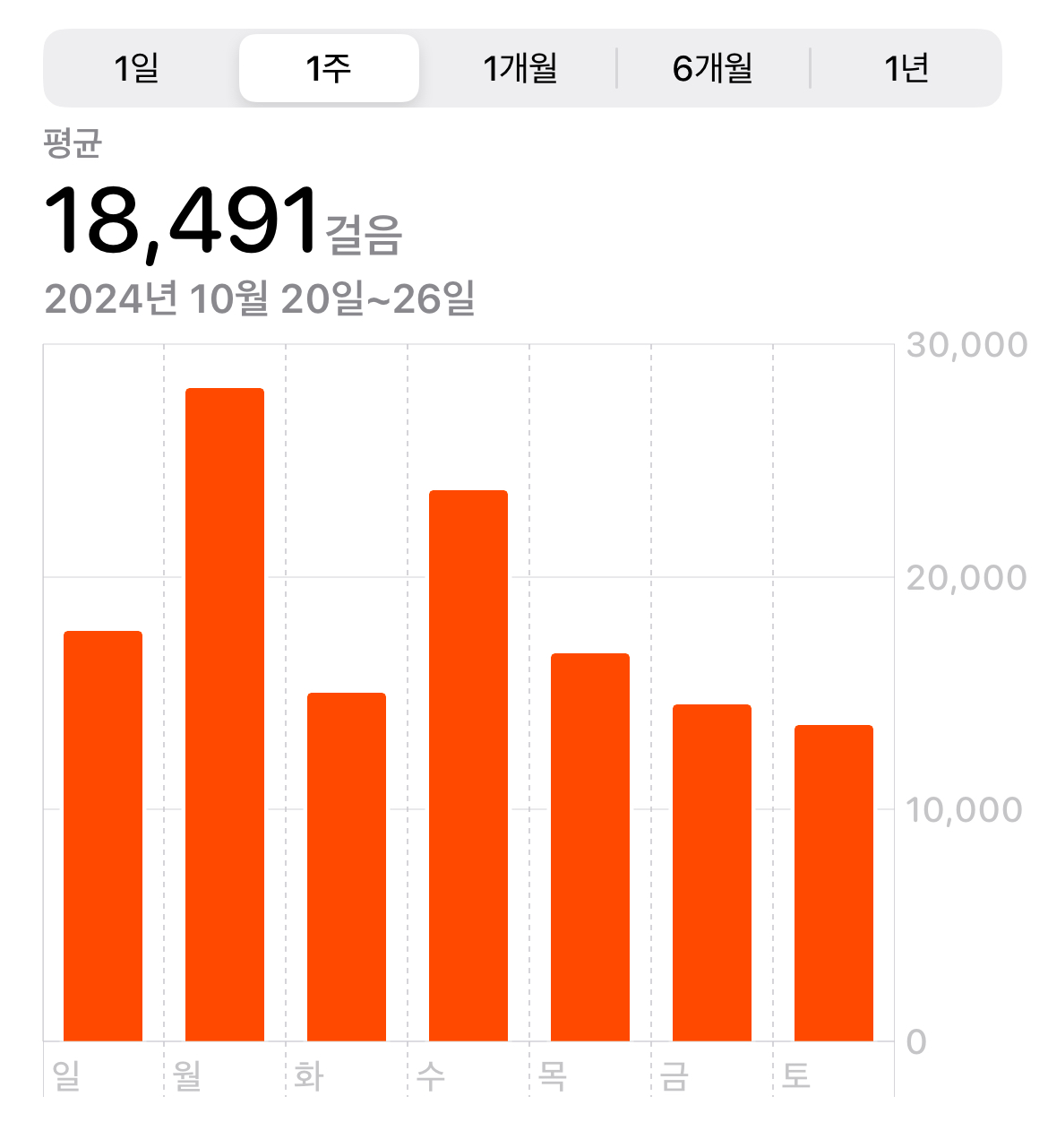 지난 주까지는 2만 보 넘게 걸었는데 이번 주에 급 피곤해져서 걸음 수를 확 줄였다. 체력이 어느정도 회복됐으니 다시 늘려보는 걸로.
