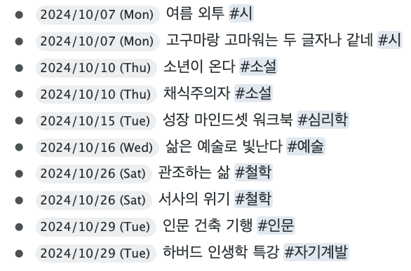 9월에 이어 10월에도 책을 많이 샀다. 이번에는 분야가 좀 다양하네. 시, 소설, 심리학, 예술, 철학 쪽 책 등을 샀고, 9월에 산 책 중에 아직 못 읽은 책들도 많아서 얼른 읽어야할텐데. ㅎㅎ 내년에 시리즈 독서모임 때 레퍼런스할만한 책들, 혹은 같이 읽어볼 책들도 사서 찬찬히 읽어보고 있다.