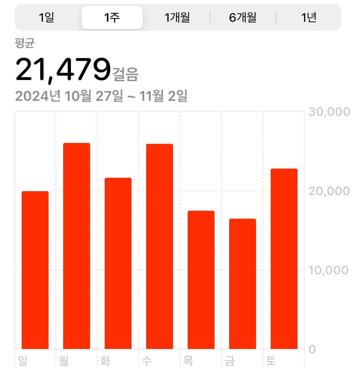 이번 주는 평균 21,479보 정도 걸었다. 10월 말부터 산책 횟수나 강도를 조금씩 줄이고 있어서 걸음 수는 계속 줄어들 거 같다.
