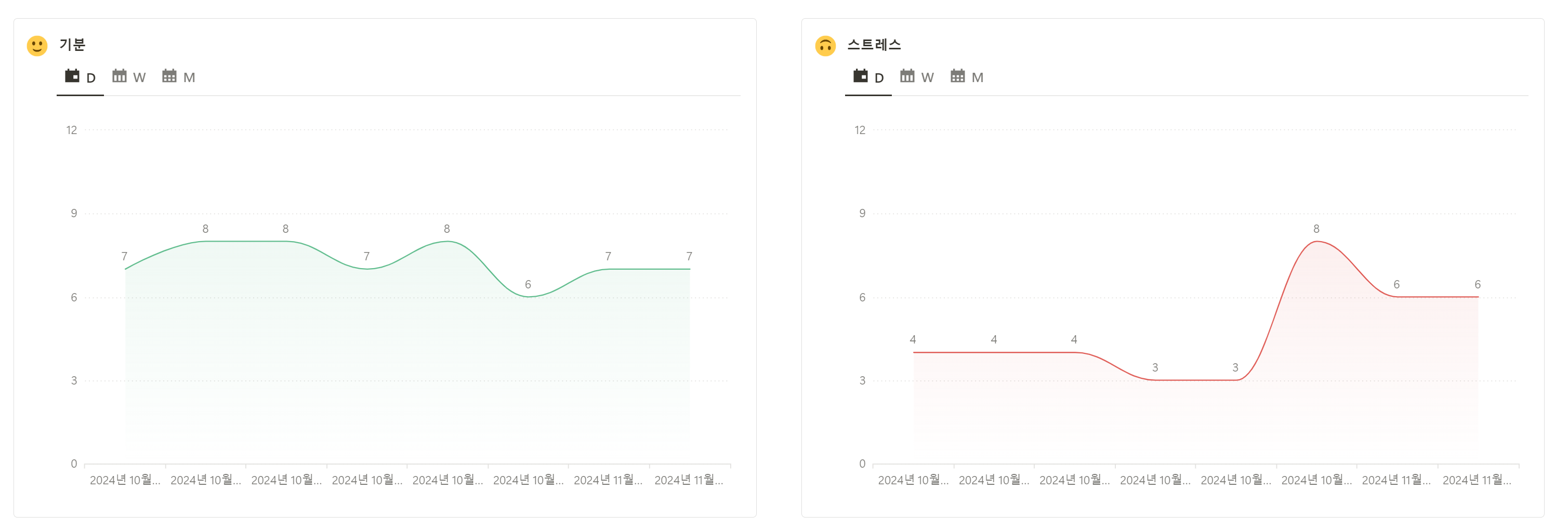 기분은 비슷. 스트레스는 특정 사건에 따라 확 올라가기도 함.