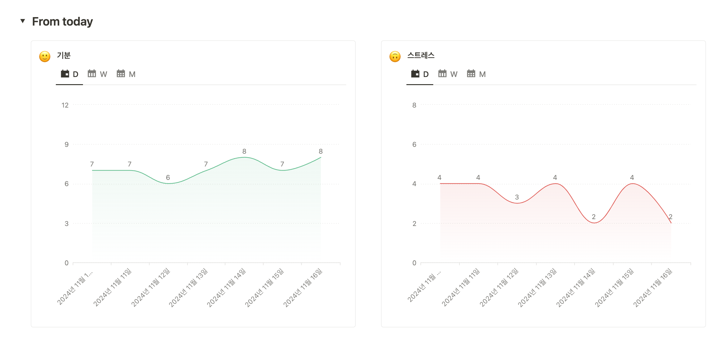 스트레스 낮았던 한 주. 기분은 7~8점대 유지.