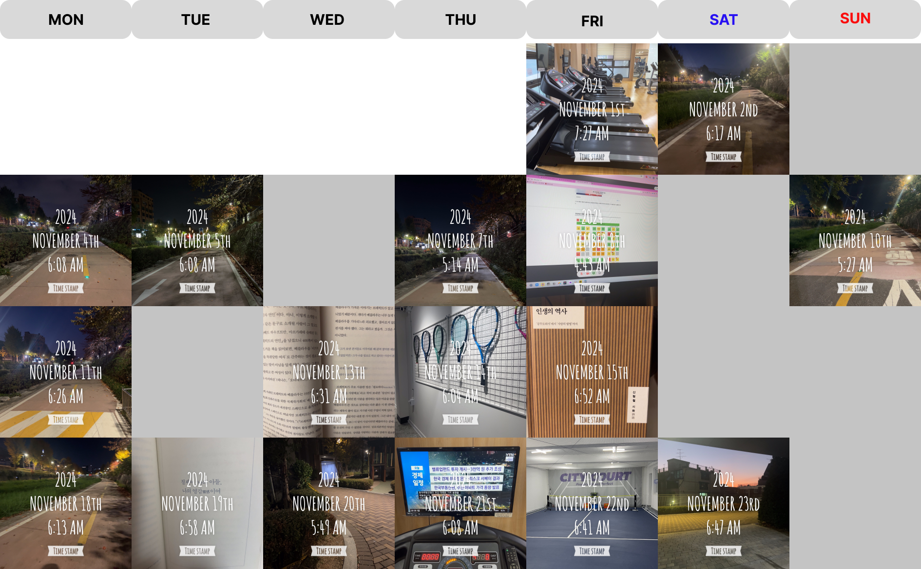 이번 주는 평일 5일 성공. 수요일은 아침 일찍 미팅이 있어서 운동을 못했고 이동 중에 찍었다. 그리고 목요일은 헬스장, 금요일은 테니스장에 가서 운동했다. 토요일도 부산 출장이 있어서 서울역 가기 전 집 앞에서 찰칵. 일요일은 피곤해서 패스.
