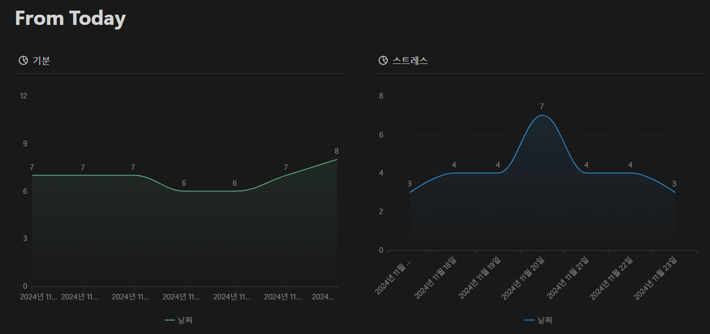 기분은 낮을 때 6점. 높을 땐 8점. 스트레스는 20일에 잠깐 치솟았다. 이미 나흘이나 지나서 저때 왜 스트레스가 높았지? 싶어 기록을 봤더니 고개를 끄덕. 기록해놓기 잘했네. 지나면 잊힌다.