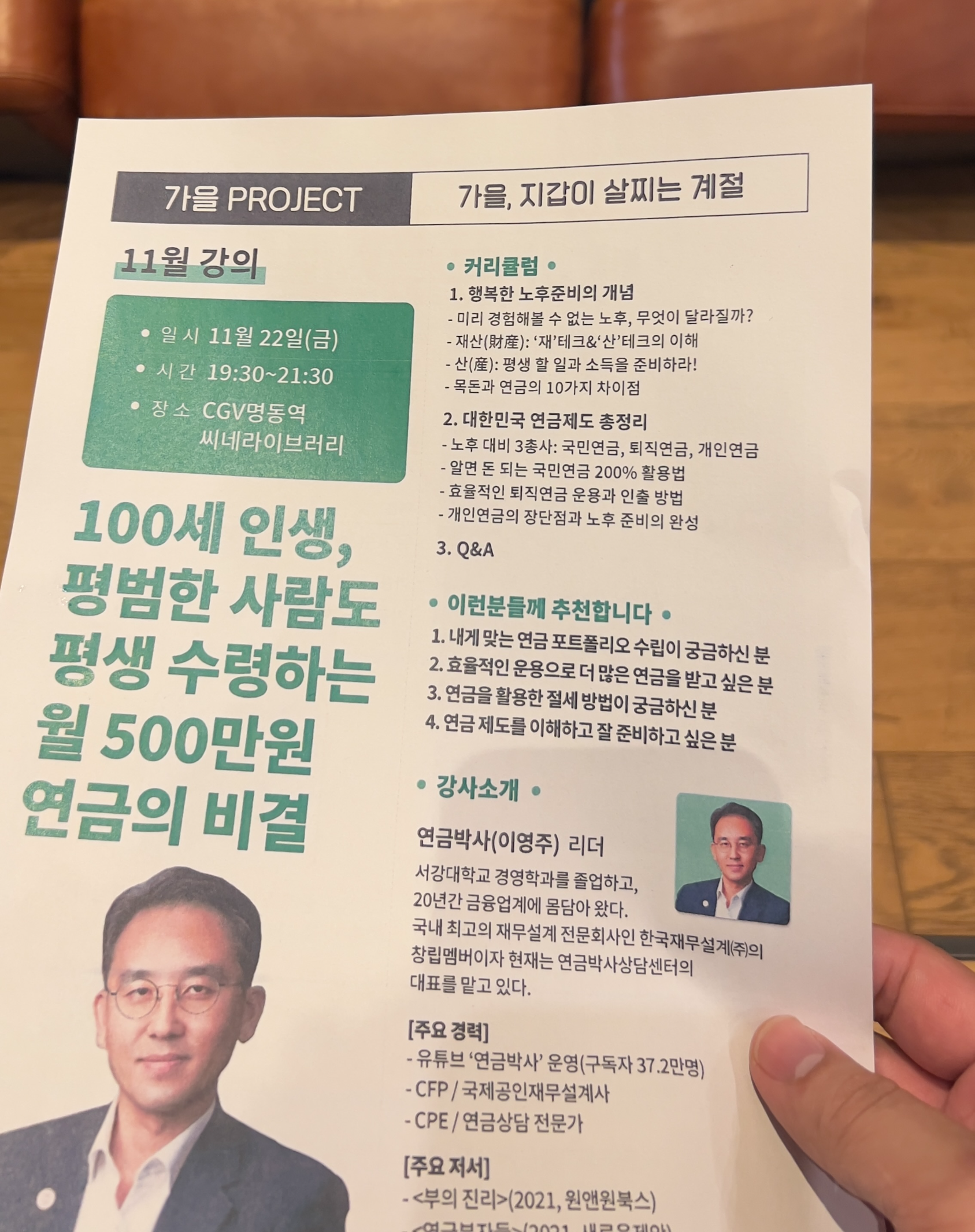 연금 강의를 듣고 왔다. 아직 연금을 받을 나이는 한참 남아서 너무 빠른다 싶다가도 강의 들으면 빨라서 나쁠 거 없다.