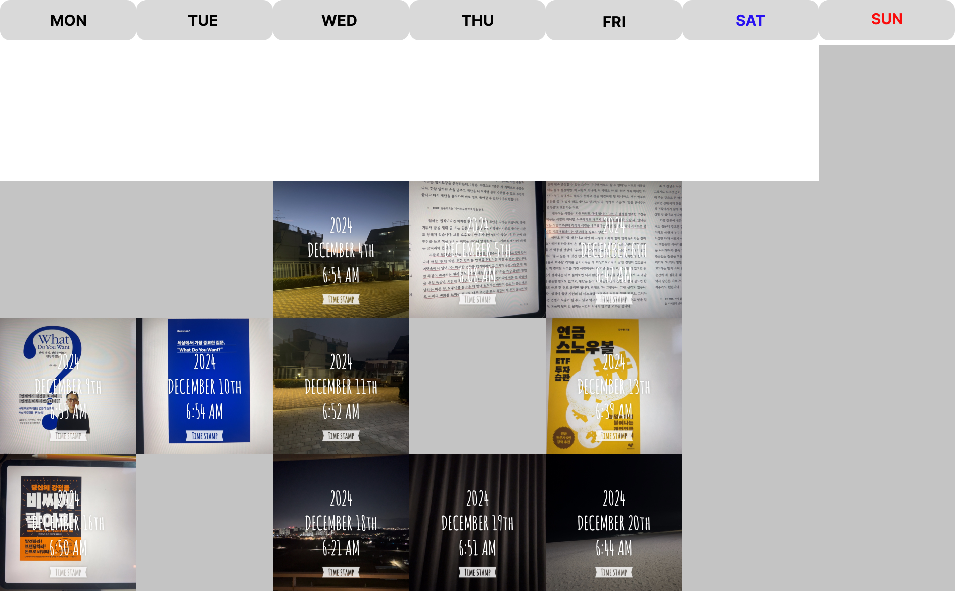 화요일은 푹 잤다. 나머지 평일은 성공. 12월이라 듬성듬성.