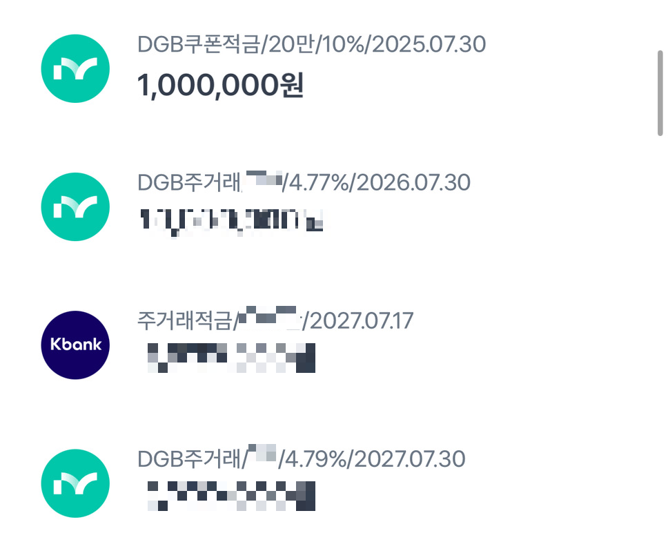 정부 세제혜택 주는 상품외에는 적금은 아래 얘들로만 남음. DGB 쿠폰 적금 제외하고는 모두 4.7~4.8% 이자 주는 26,27년 만기되는 애들. 얘네만 꾸준히 넣으면 되서 당분간 신규는 특판이 나오지 않는 한 가입 안 할 것 같다.