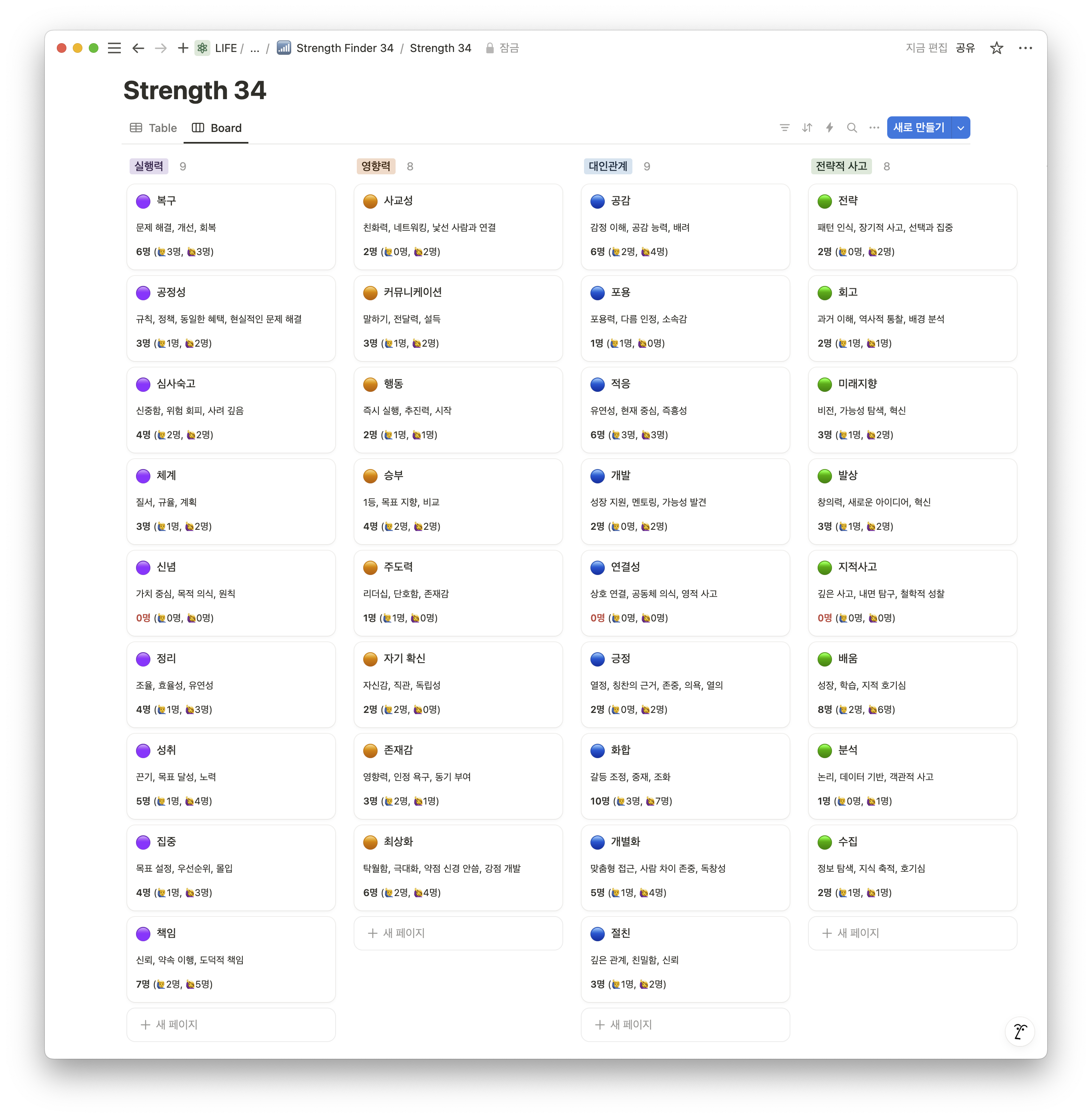 이번 주에 시간을 좀 들여서 노션에 강점을 정리했다. 내가 가지고 있는 강점 DB가 23명 정도 되는데, 정리해보니 화합이 10명으로 가장 많았다. 연결성이나 지적사고, 신념은 0명. 올해 이 강점 가진 사람들 좀 만나봐야지. 어떤 사람들일지 궁금하다.