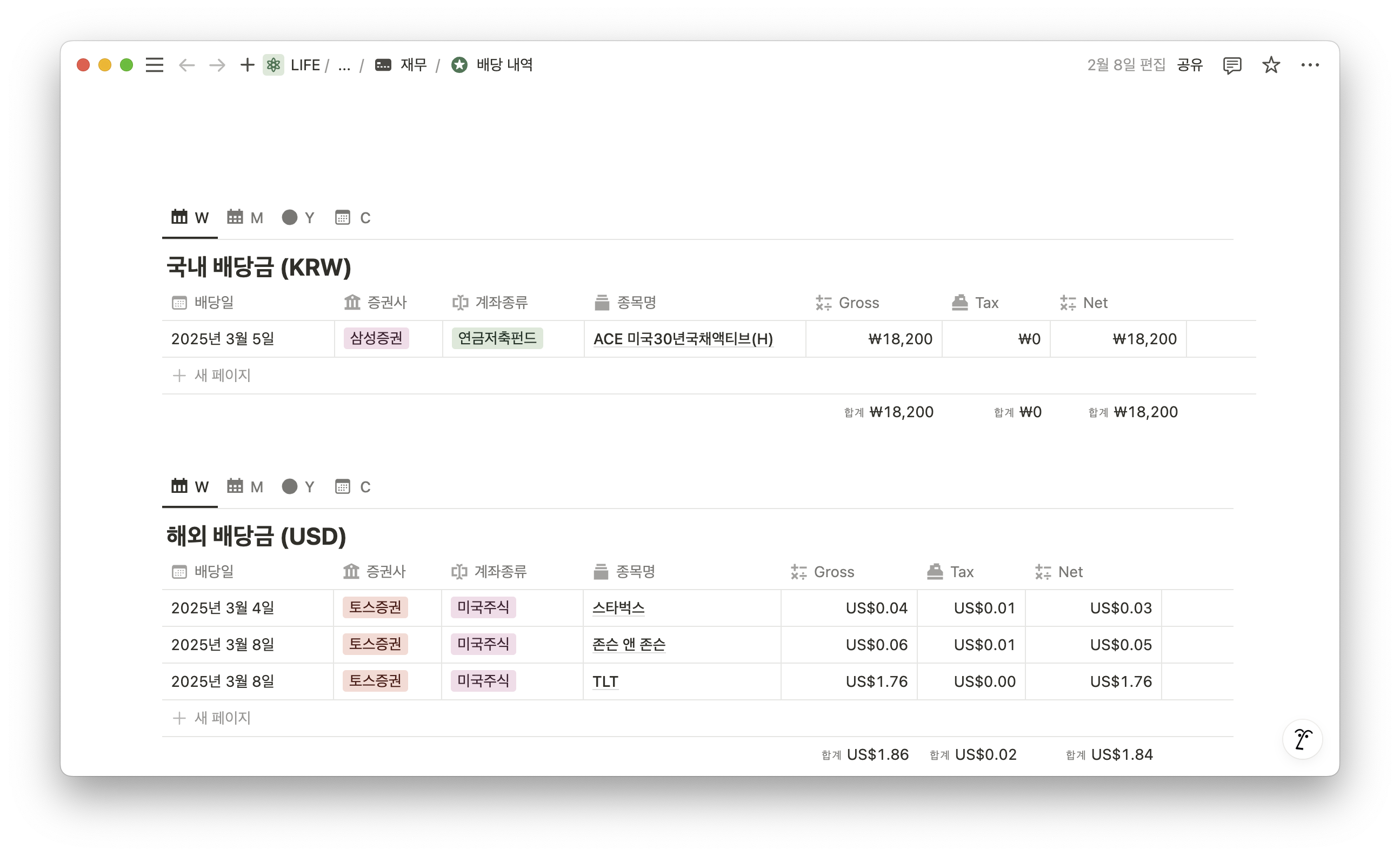 국내는 연금저축펀드에 배당이 하나 들어왔고, 해외는 소수점으로 모으는 종목들의 배당이 들어왔다. 아주 소소한 금액. 4월 배당이 다가온다. 기대 중.