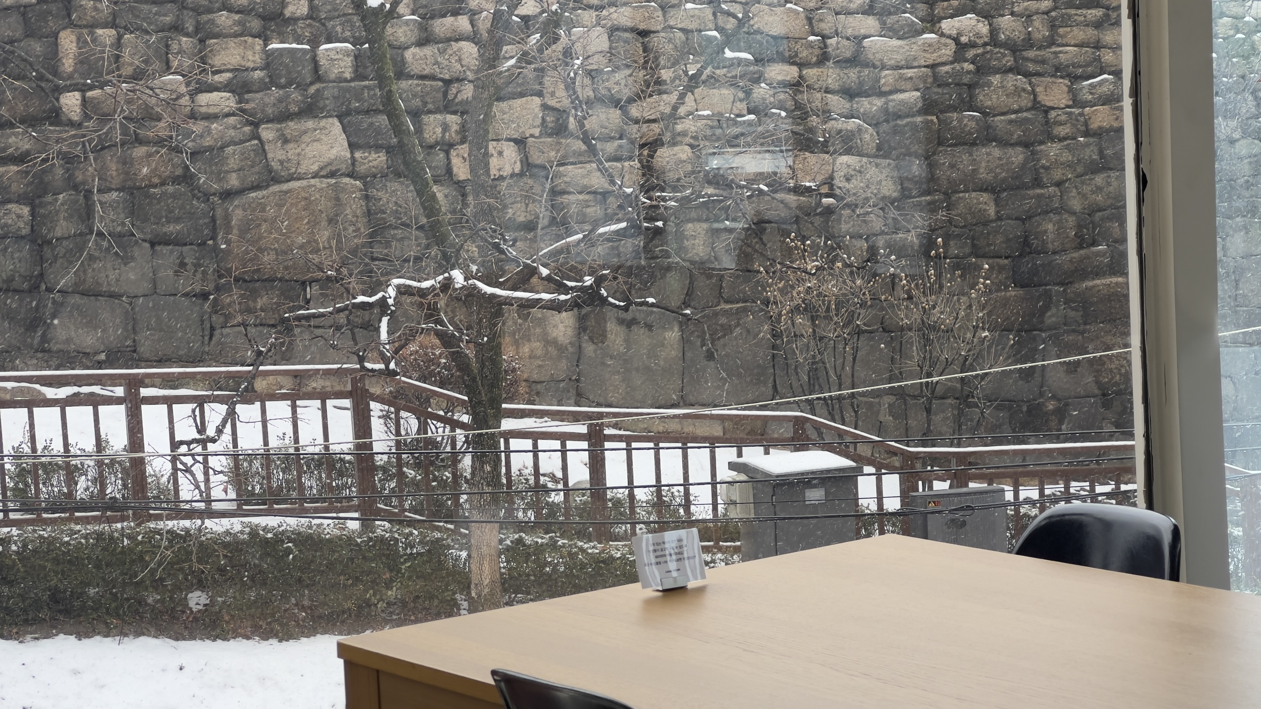 화요일 오전에 눈이 펑펑 내렸다. 눈이 내리면 사무실 풍경은 멋있다. 작년 가을부터 여기에 둥지를 틀었는데 가을, 겨울을 보내보니 계절마다 멋진 곳이라 자꾸 사무실이 오고 싶어진다. 곧 다가올 봄, 여름의 풍경도 기대된다.