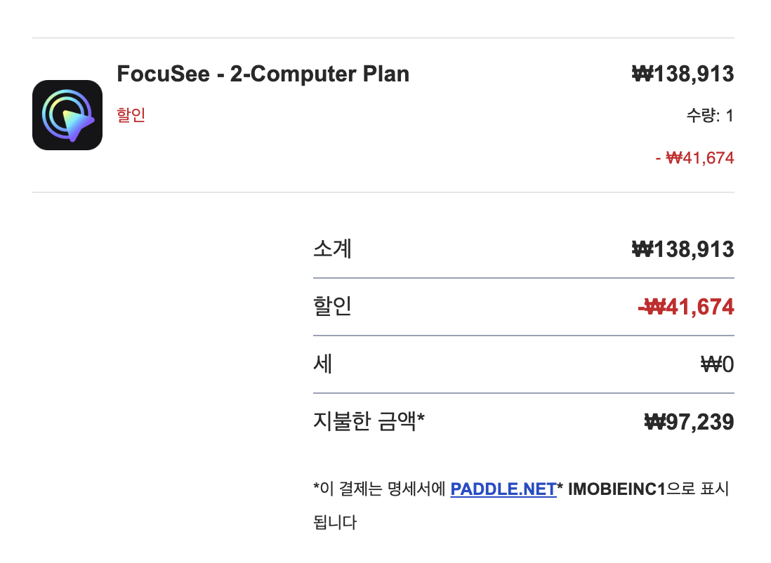 템플릿을 팔아보니, 영상 쪽도 신경을 많이 써야되서 FocuSee라고 하는 편집 프로그램도 하나 구입했다. 이건 컴퓨터 대수에 따라 요금제가 달라서 2대용으로 샀다. 맥미니랑 맥북에 라이센스 세팅할 예정. 30% 할인쿠폰에 VAT 면제 받으니 약 10만원 정도 나왔다. 오랜만에 사는 거금의 소프트웨어네 👀 사놓고 잘 안 쓸까봐 고민했는데, 이왕 샀으니 열심히 만들어보자.