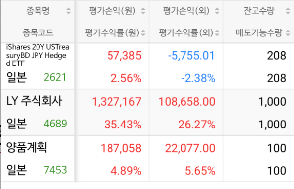 여행할 때 엔화가 오른 건 아쉽긴 하지만, 주식투자할 땐 너무나 좋죠. 일본에서 라인 야후, 양품계획(무인양품)에 투자하고 있는데 요새 실적도 좋고 엔화도 올라서 수익률이 괜찮습니다. 미국이 요즘 좋지 않아서 아쉬운데, 일본에서 위안을 주네요.